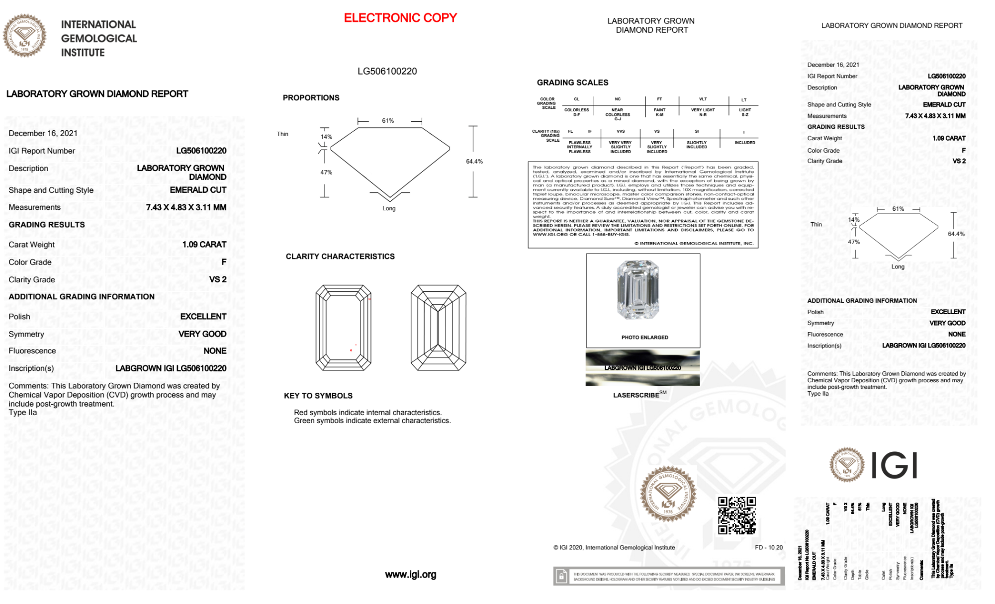 Your 1.09 carat Emerald lab diamond is graded F color (Colorless), and you can read more about F color diamonds here.