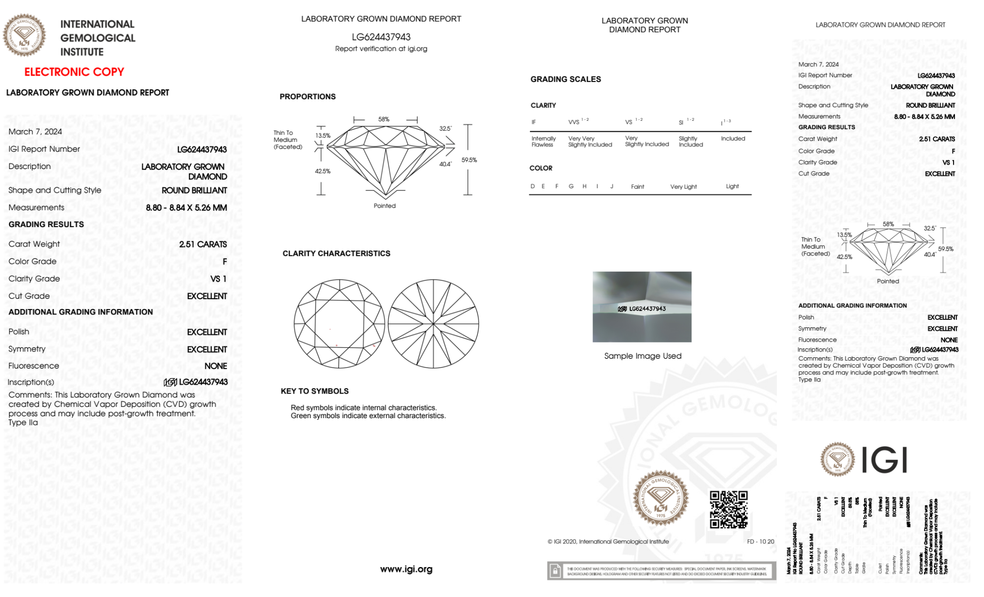 Your 2.51 carat Round lab diamond is graded VS1 clarity, which stands for Very Slightly Included 1. Read more about VS1 clarity diamonds here, or learn more about diamond clarity in general here.