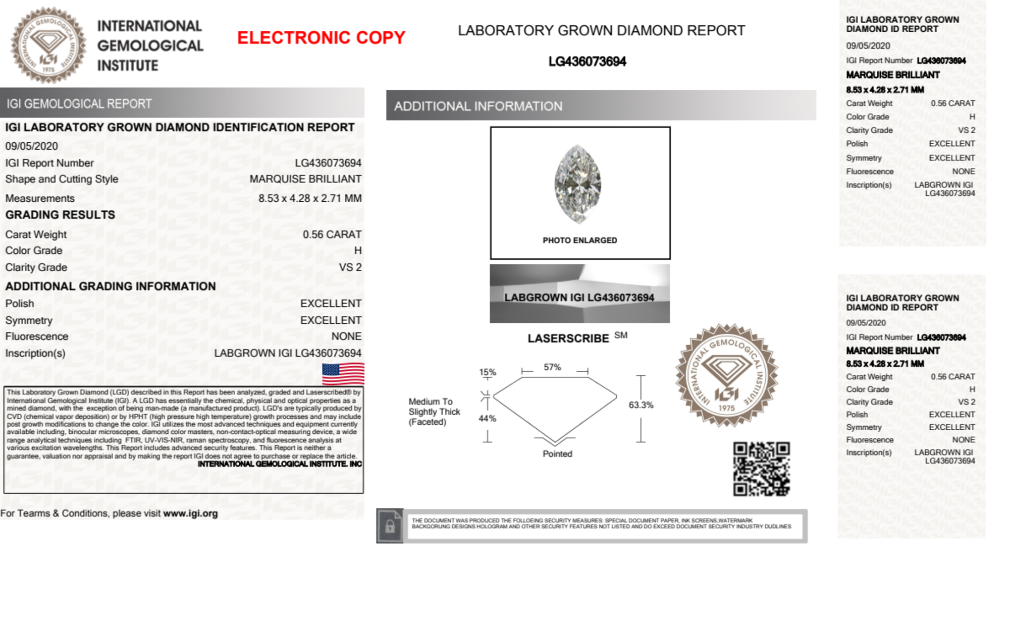 Your 0.56 carat Marquise lab diamond is graded VS2 clarity, which stands for Very Slightly Included 2. Read more about VS2 clarity diamonds here, or learn more about diamond clarity in general here.