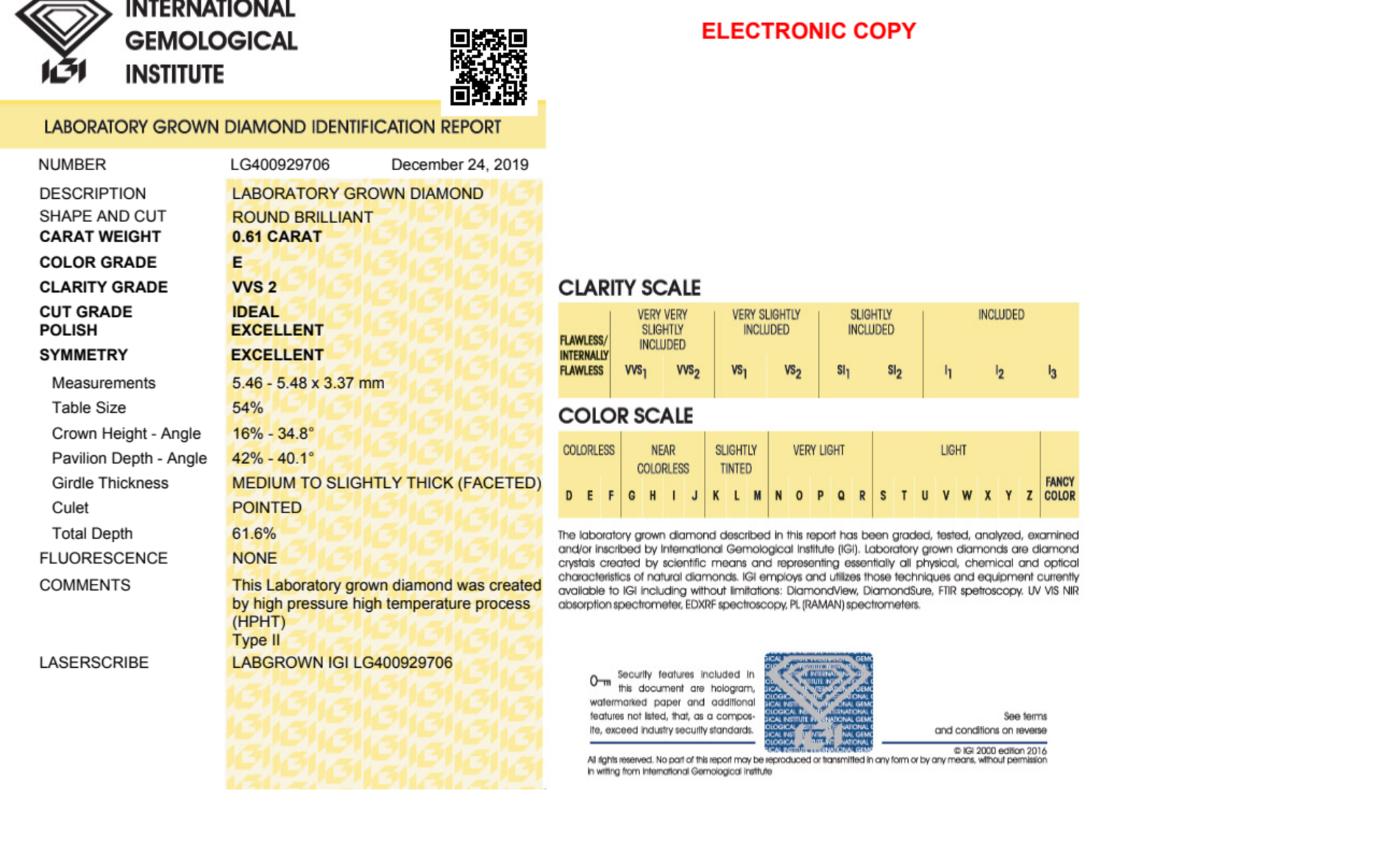 Your 0.61 carat Round lab diamond is graded E color (Colorless), and you can read more about E color diamonds here.