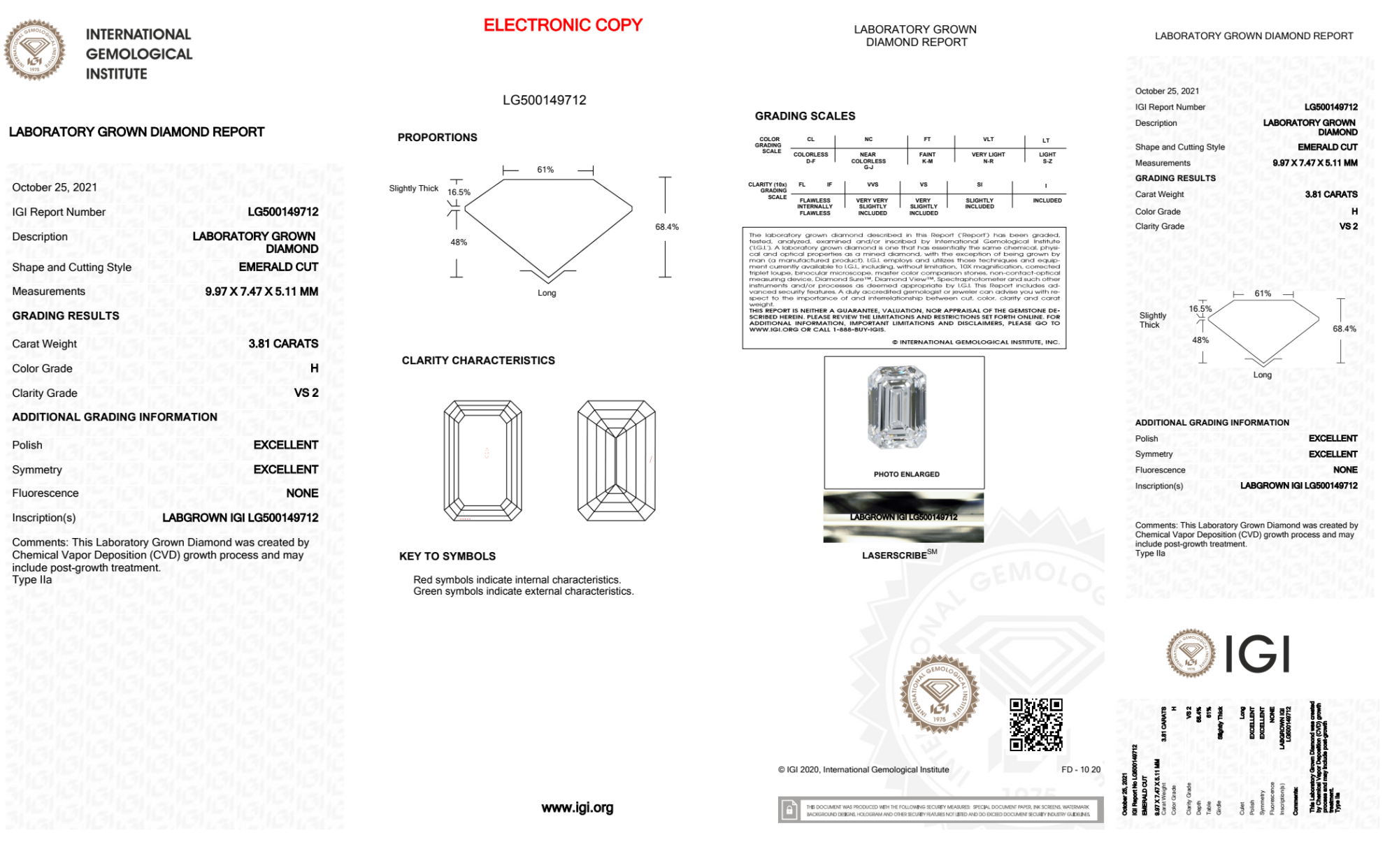 Your 3.81 carat Emerald lab diamond is graded VS2 clarity, which stands for Very Slightly Included 2. Read more about VS2 clarity diamonds here, or learn more about diamond clarity in general here.