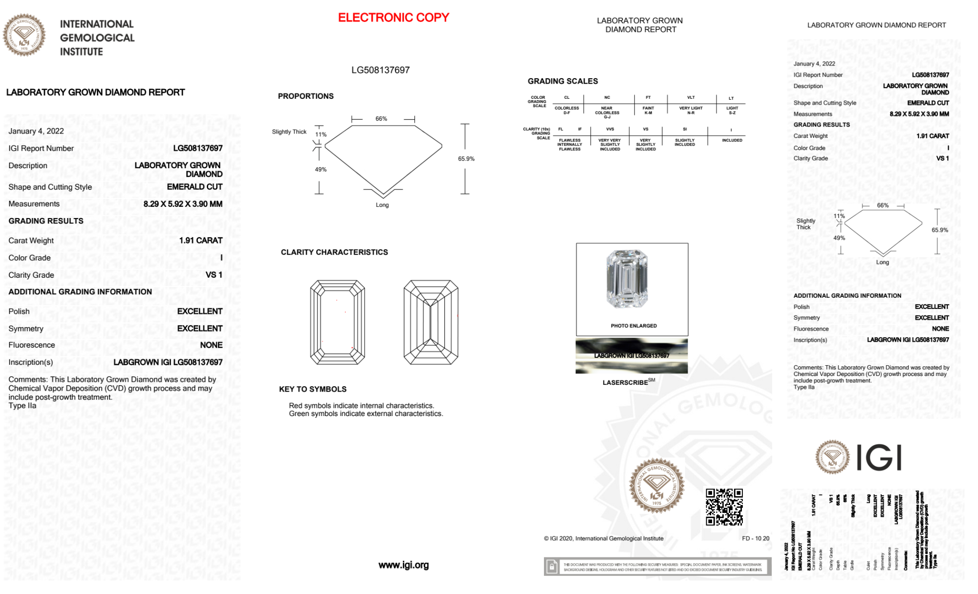 Your 1.91 carat Emerald lab diamond is graded I color (Near Colorless), and you can read more about I color diamonds here.