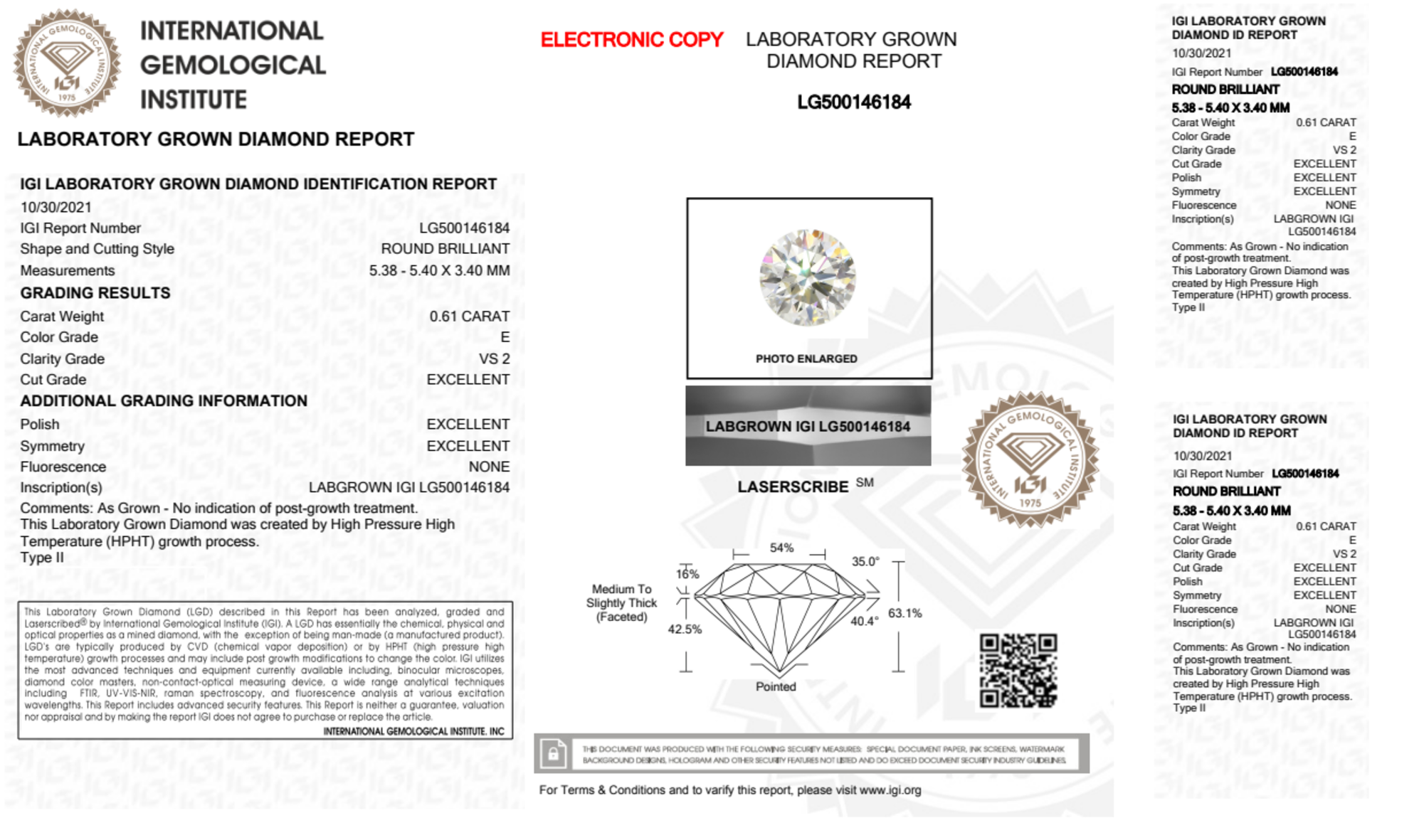 Your 0.61 carat Round lab diamond is graded E color (Colorless), and you can read more about E color diamonds here.