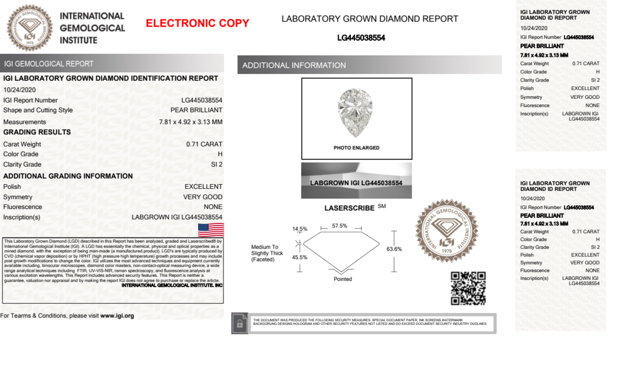 Your 0.71 carat Pear lab diamond is graded H color (Near Colorless), and you can read more about H color diamonds here.