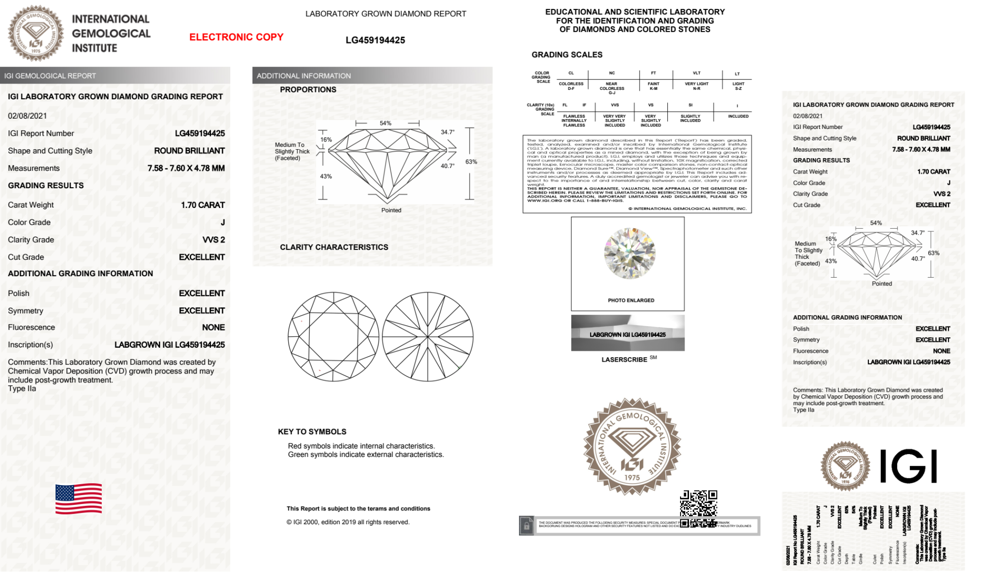 Your 1.70 carat Round lab diamond is graded J color (Near Colorless), and you can read more about J color diamonds here.