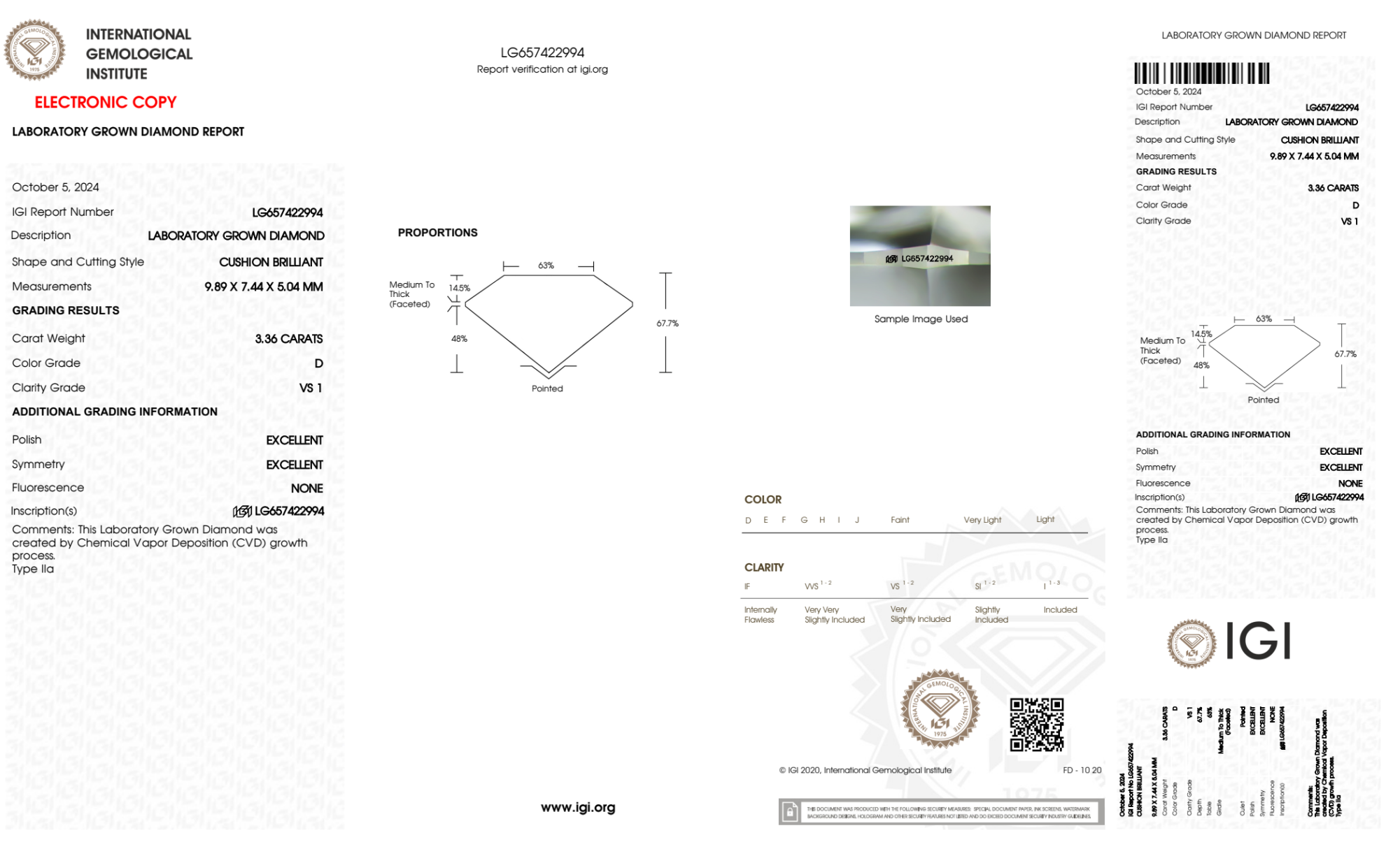 Your 3.36 carat Cushion lab diamond is graded D color (Colorless), and you can read more about D color diamonds here.