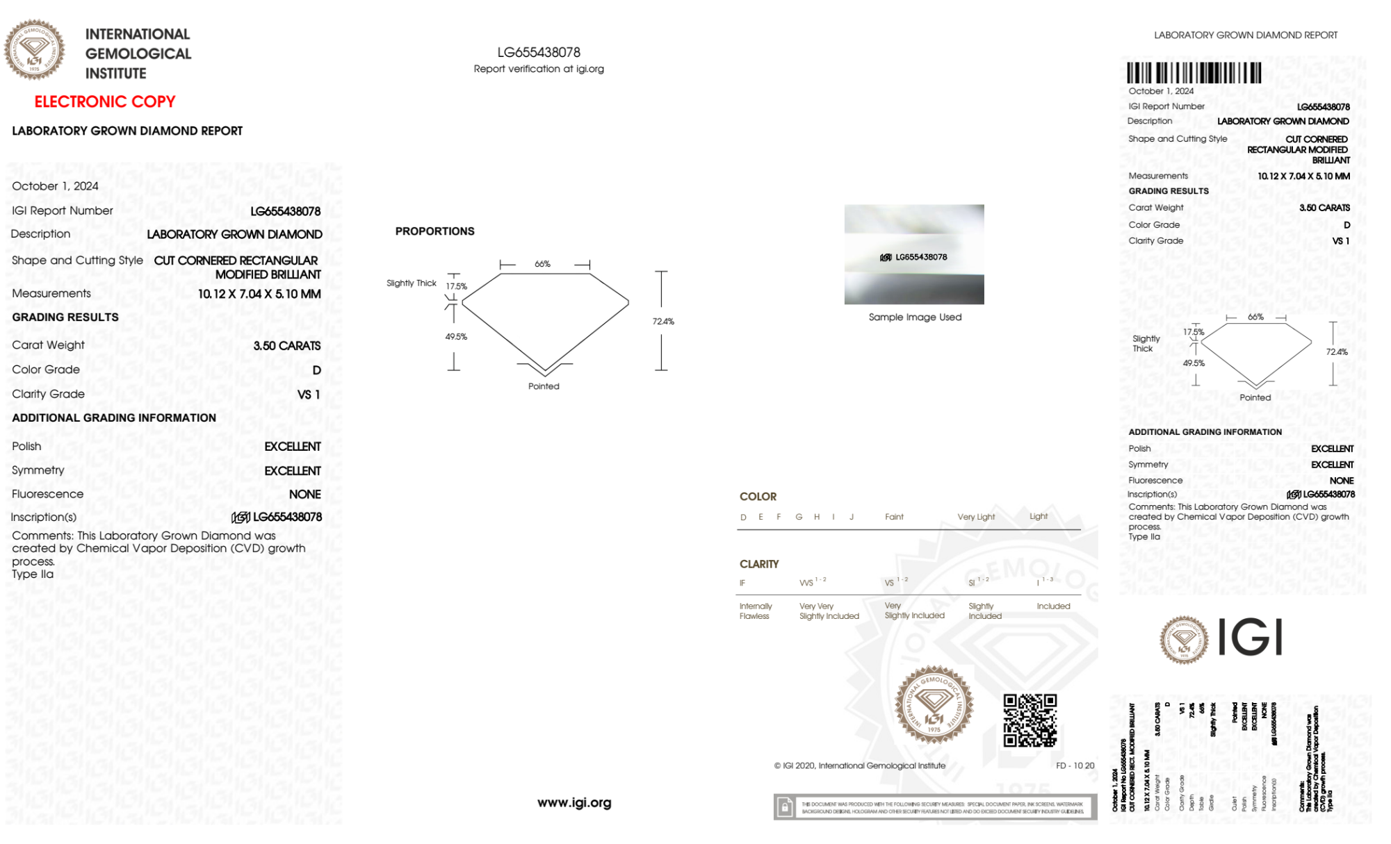 Your 3.50 carat Radiant lab diamond is graded D color (Colorless), and you can read more about D color diamonds here.