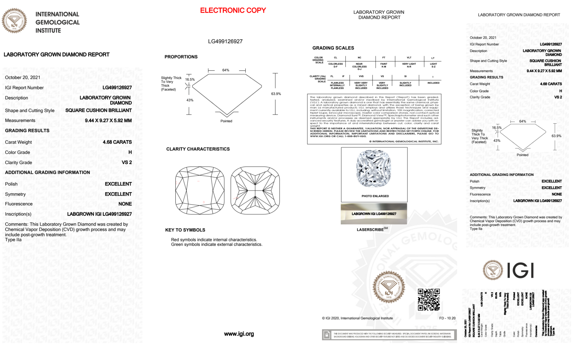 Your 4.68 carat Cushion lab diamond is graded H color (Near Colorless), and you can read more about H color diamonds here.