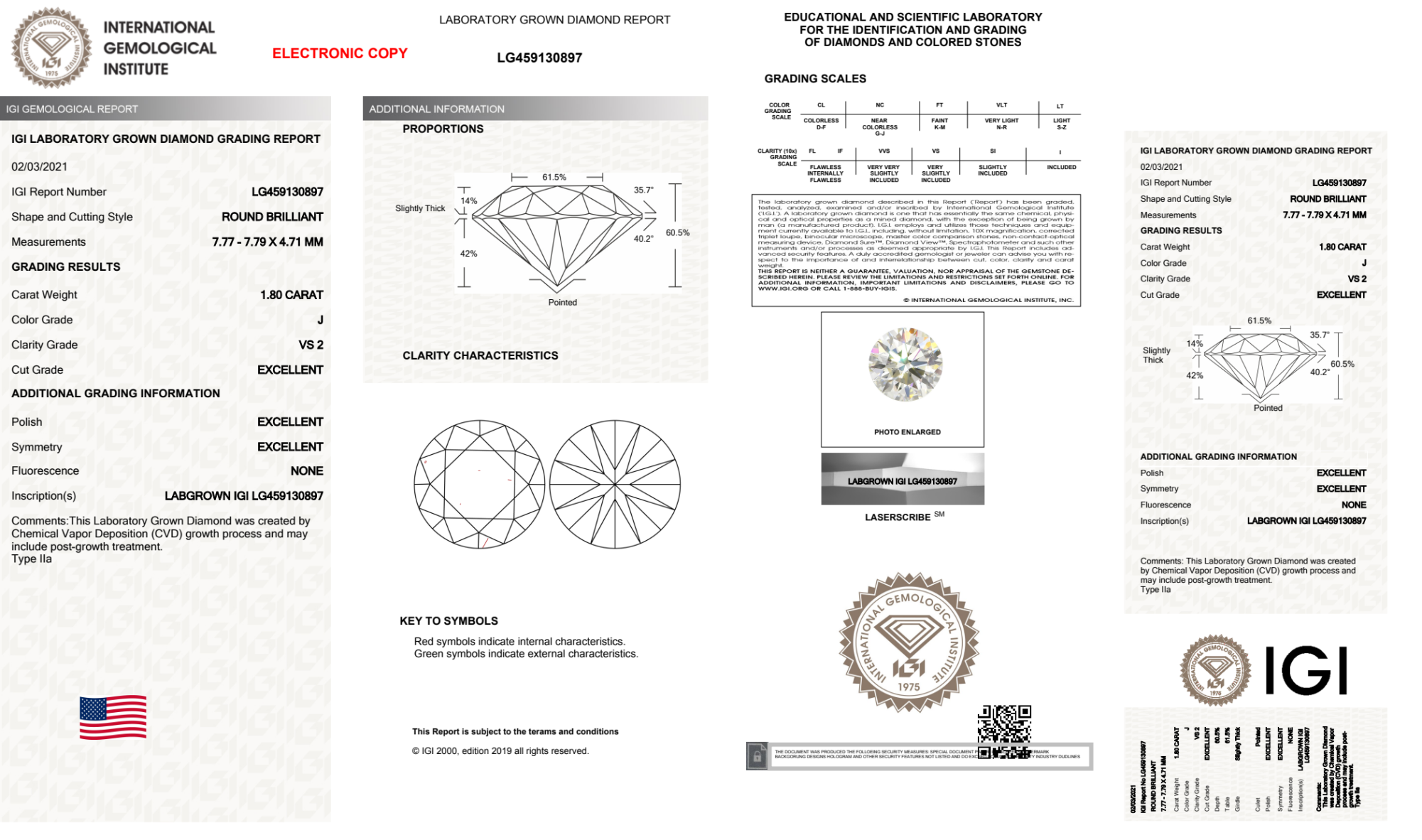 Your 1.80 carat Round lab diamond is graded J color (Near Colorless), and you can read more about J color diamonds here.