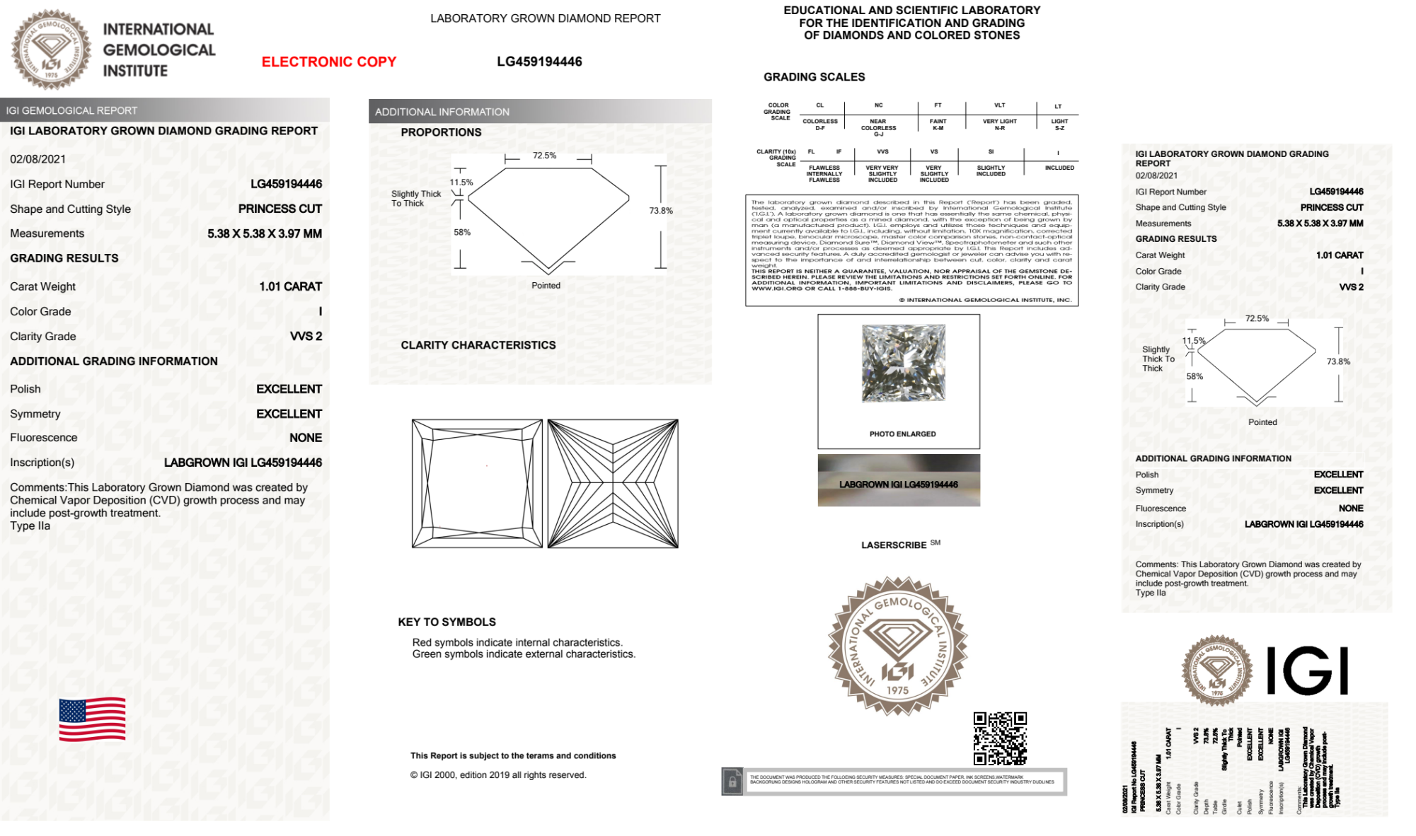 Your 1.01 carat Princess lab diamond is graded VVS2 clarity, which stands for Very Very Slightly Included 2. Read more about VVS2 clarity diamonds here, or learn more about diamond clarity in general here.