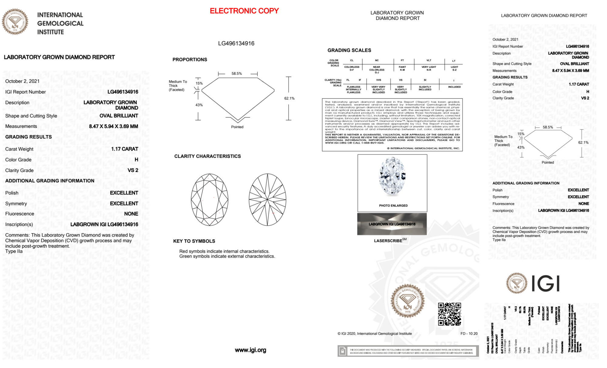 Your 1.17 carat Oval lab diamond is graded H color (Near Colorless), and you can read more about H color diamonds here.