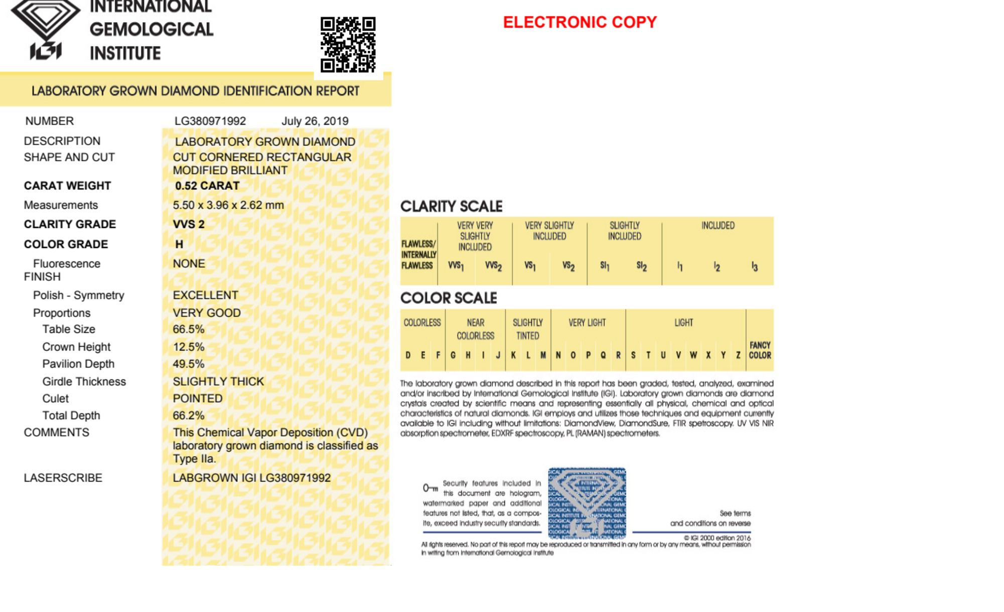 Your 0.52 carat Radiant lab diamond is graded H color (Near Colorless), and you can read more about H color diamonds here.