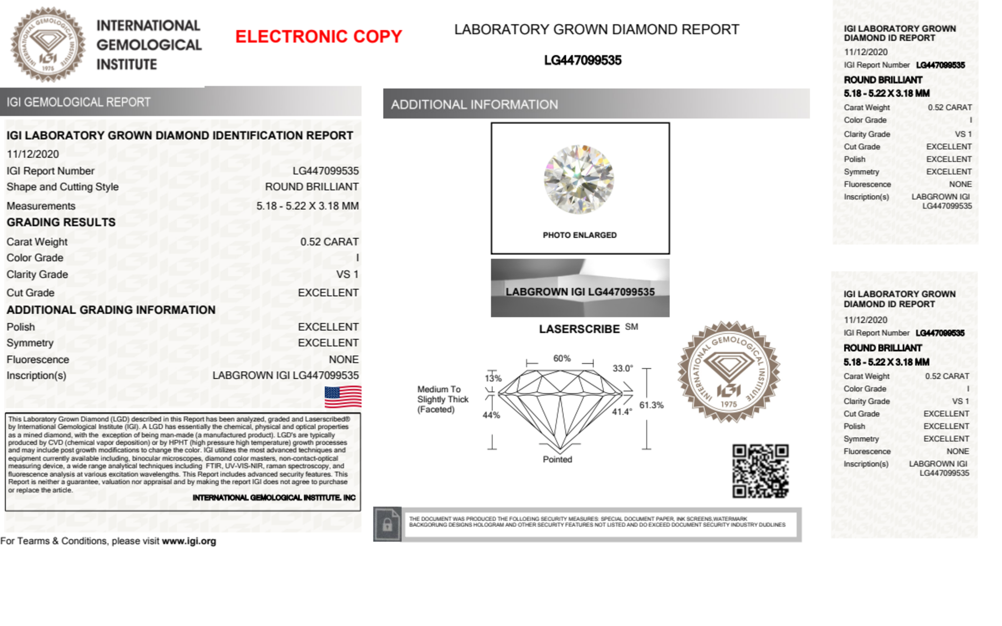 Your 0.52 carat Round lab diamond is graded VS1 clarity, which stands for Very Slightly Included 1. Read more about VS1 clarity diamonds here, or learn more about diamond clarity in general here.