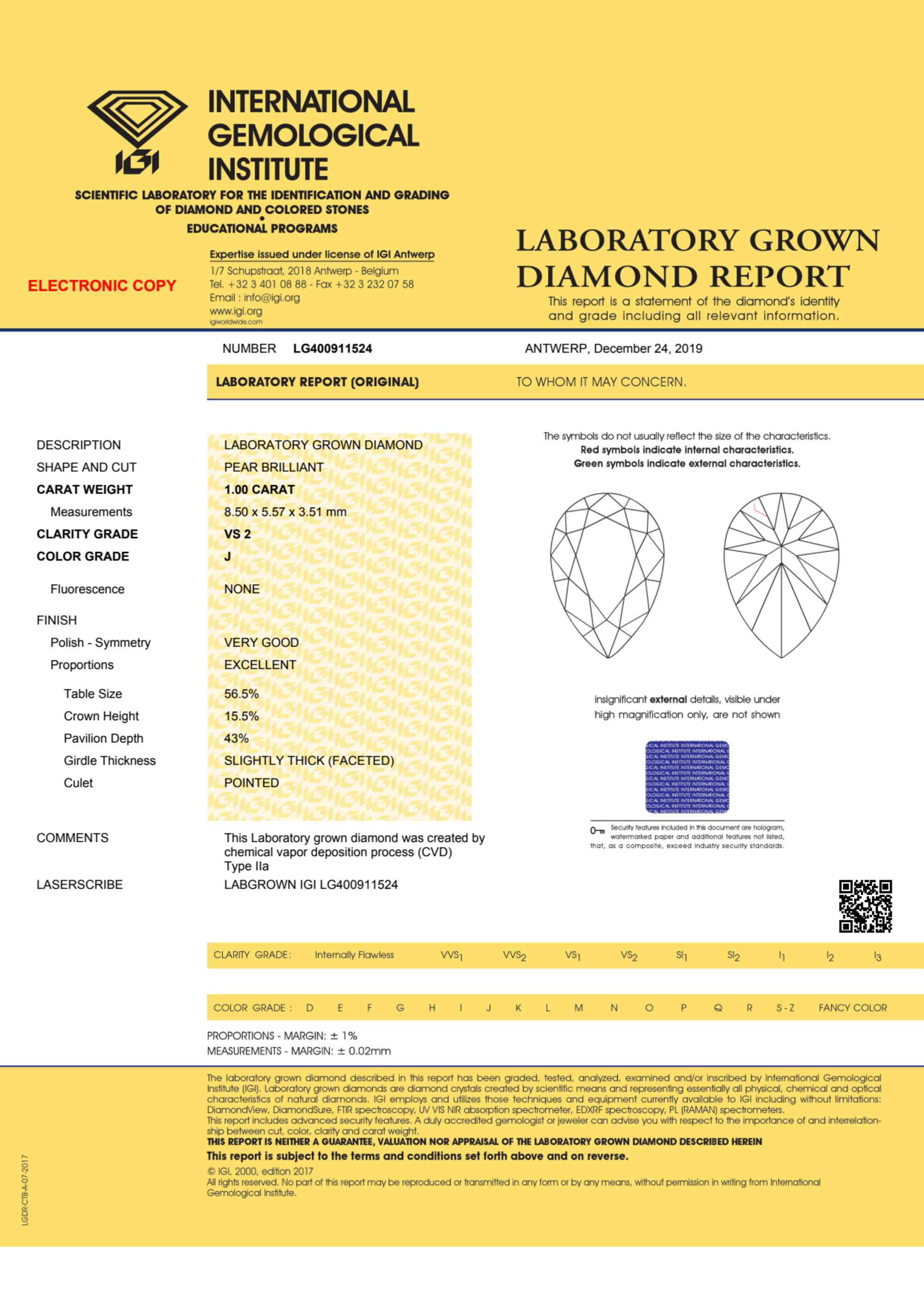 Your 1.00 carat Pear lab diamond is graded J color (Near Colorless), and you can read more about J color diamonds here.