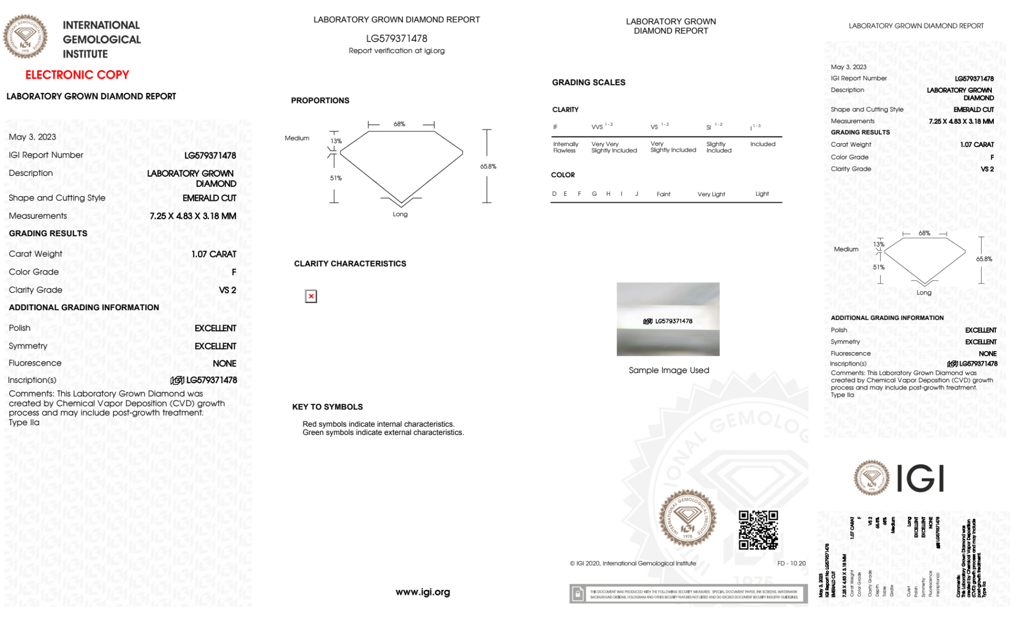 Your 1.07 carat Emerald lab diamond is graded F color (Colorless), and you can read more about F color diamonds here.