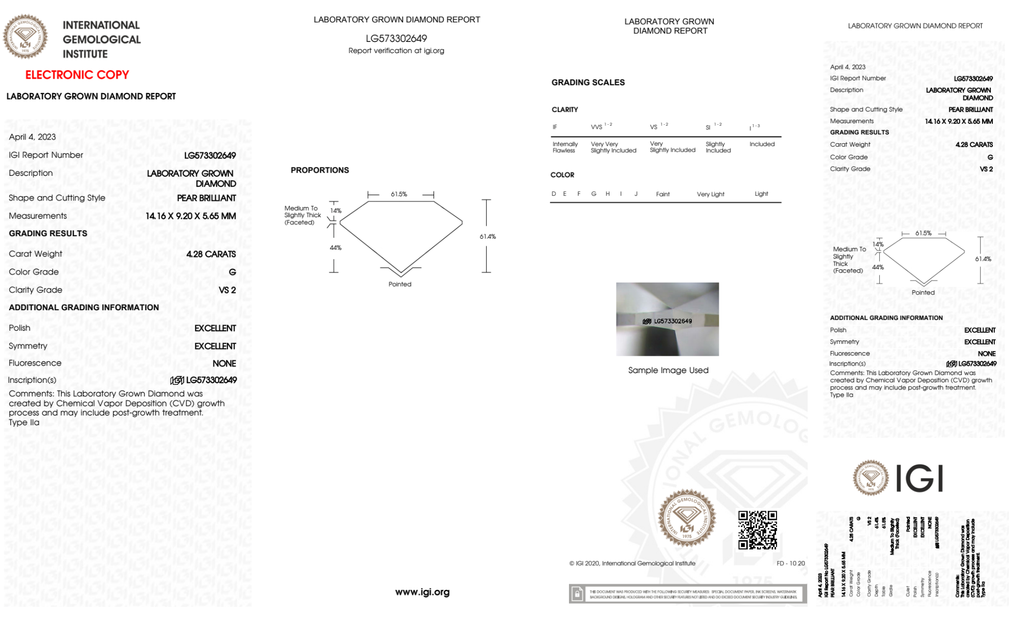 Your 4.28 carat Pear lab diamond is graded G color (Near Colorless), and you can read more about G color diamonds here.