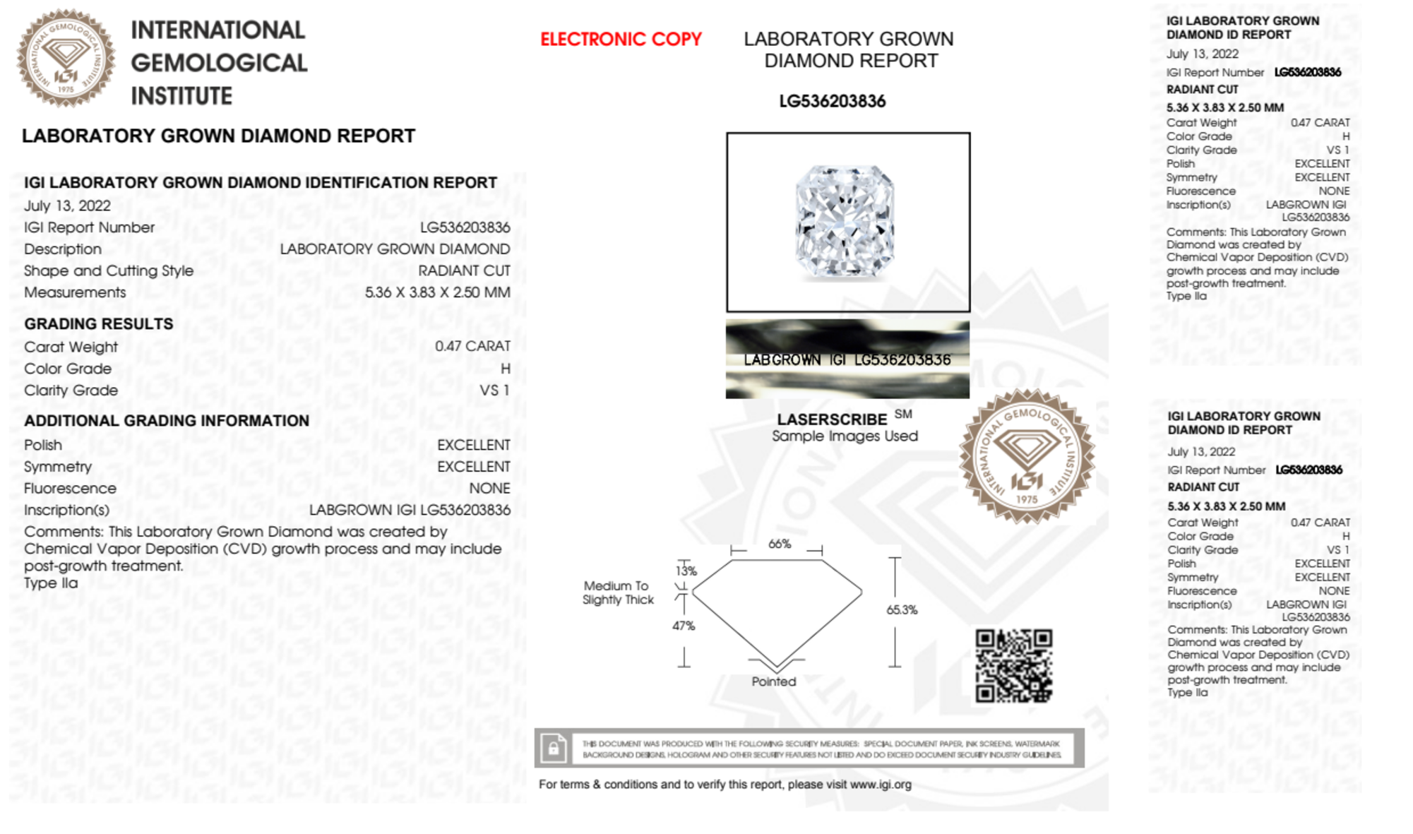 Your 0.47 carat Radiant lab diamond is graded H color (Near Colorless), and you can read more about H color diamonds here.