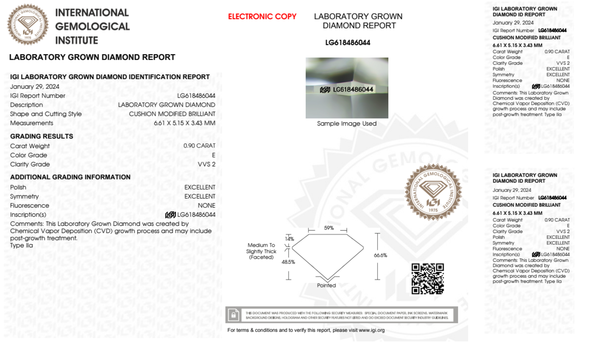 Your 0.90 carat Cushion lab diamond is graded E color (Colorless), and you can read more about E color diamonds here.