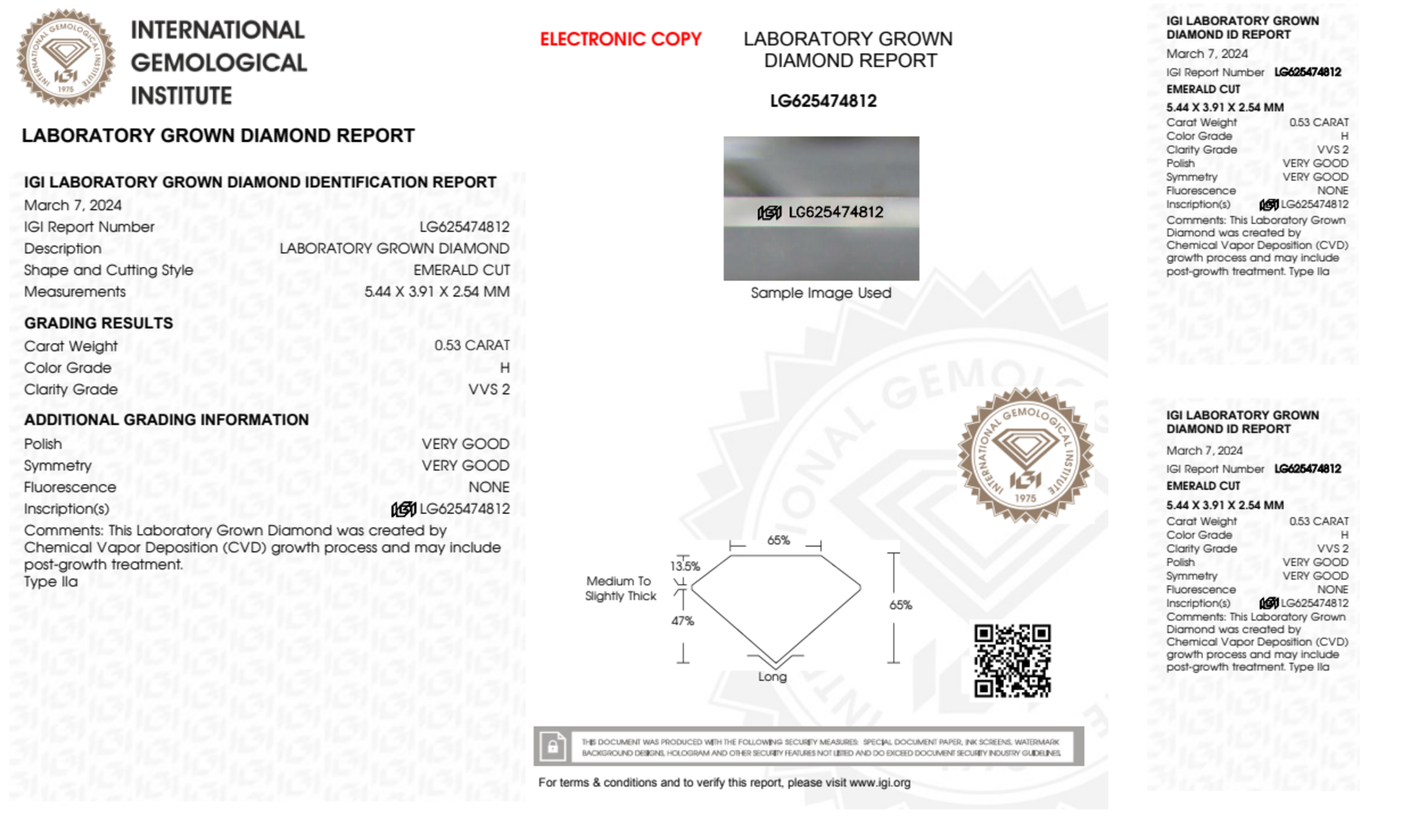 Your 0.53 carat Emerald lab diamond is graded VVS2 clarity, which stands for Very Very Slightly Included 2. Read more about VVS2 clarity diamonds here, or learn more about diamond clarity in general here.