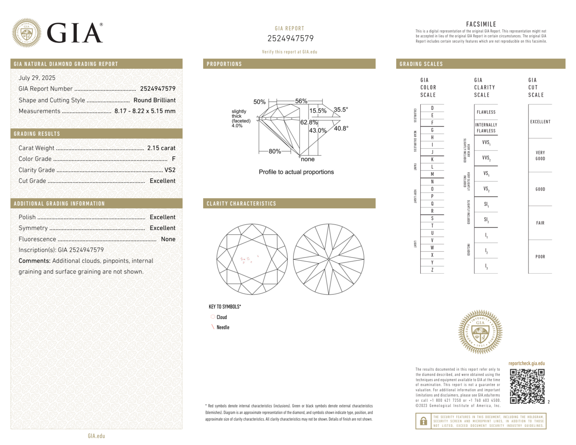 Your 2.15 carat Round natural diamond is graded VS2 clarity, which stands for Very Slightly Included 2. Read more about VS2 clarity diamonds here, or learn more about diamond clarity in general here.