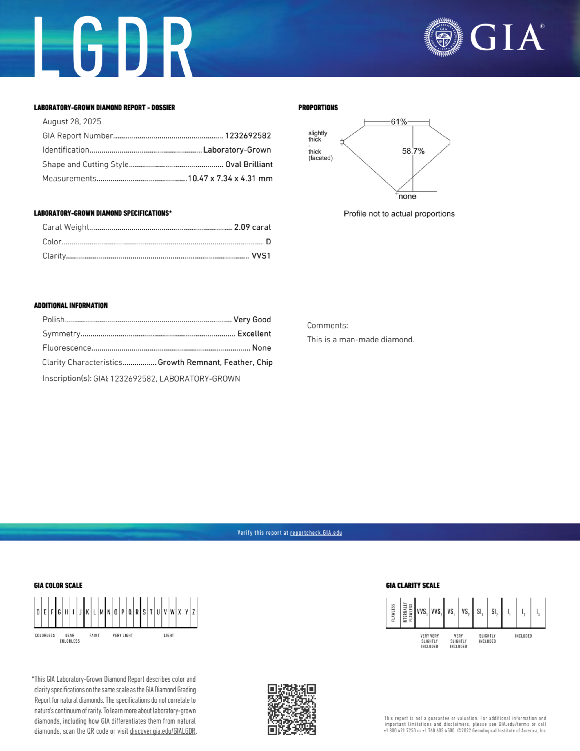 Your 2.09 carat Oval lab diamond is graded D color (Colorless), and you can read more about D color diamonds here.