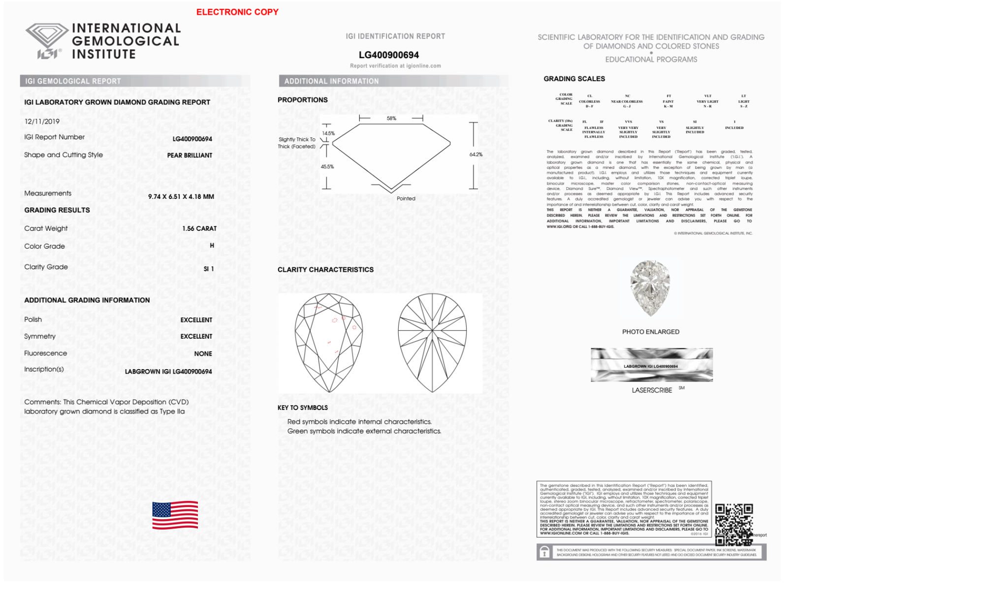Your 1.56 carat Pear lab diamond is graded H color (Near Colorless), and you can read more about H color diamonds here.