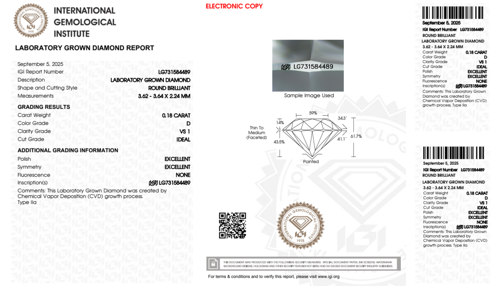 Your 0.18 carat Round lab diamond is graded D color (Colorless), and you can read more about D color diamonds here.