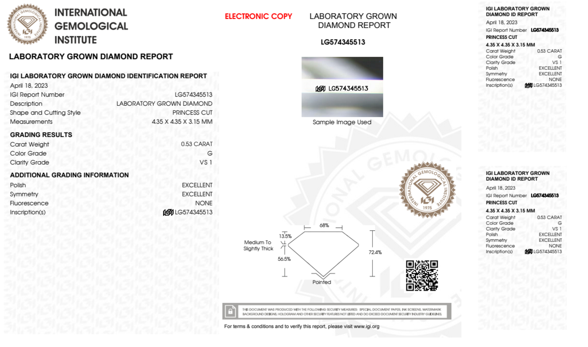 Your 0.53 carat Princess lab diamond is graded G color (Near Colorless), and you can read more about G color diamonds here.