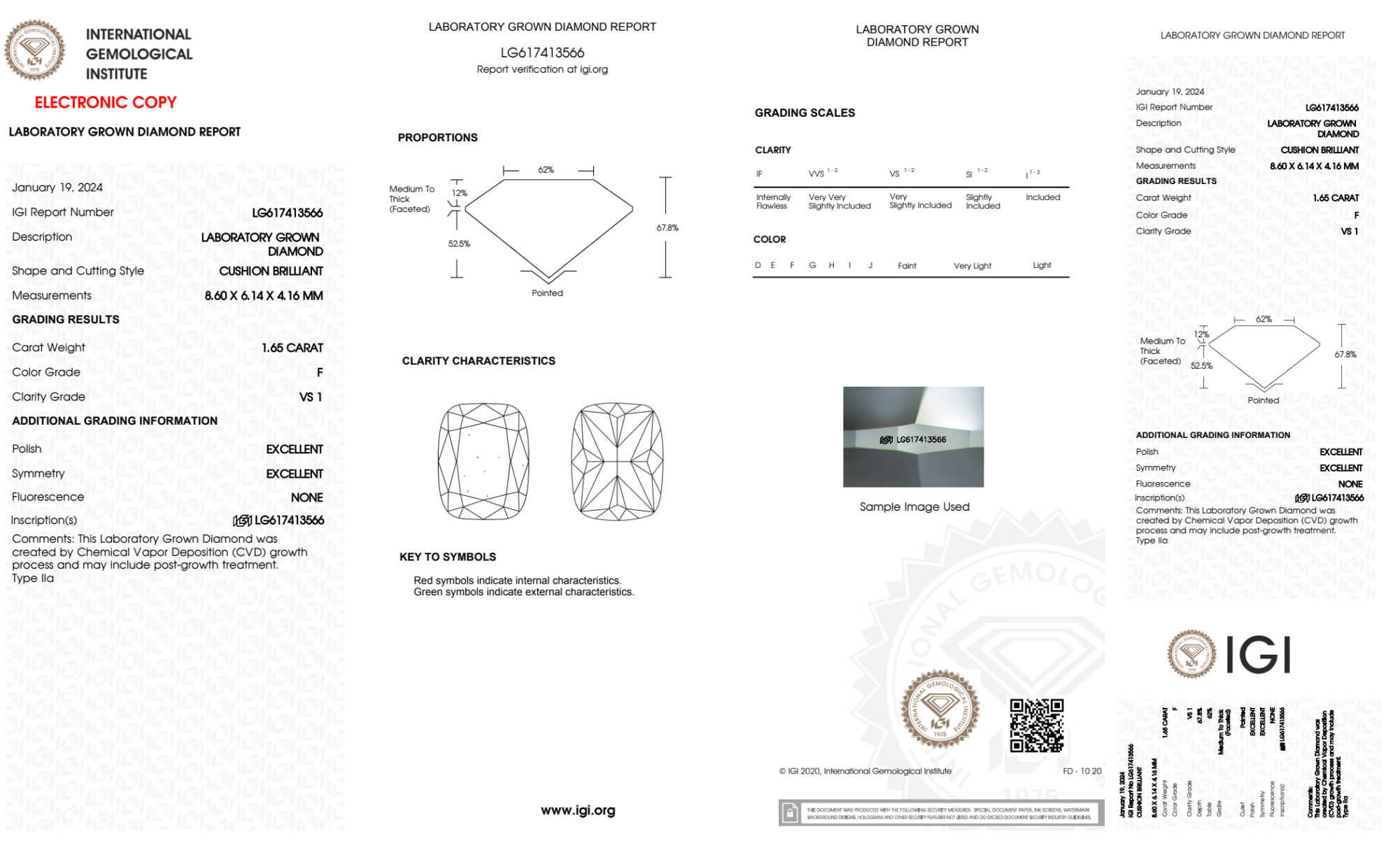 Your 1.65 carat Cushion lab diamond is graded F color (Colorless), and you can read more about F color diamonds here.