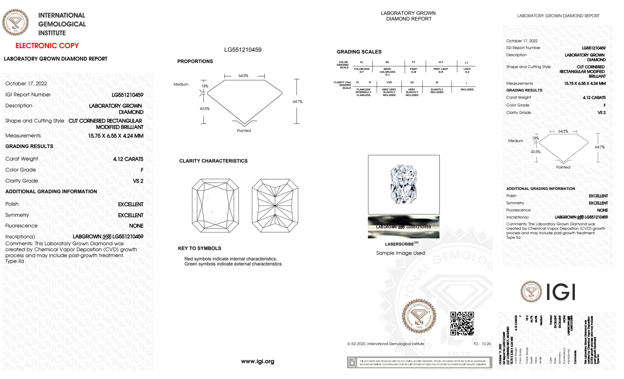 Your 4.12 carat Radiant lab diamond is graded F color (Colorless), and you can read more about F color diamonds here.