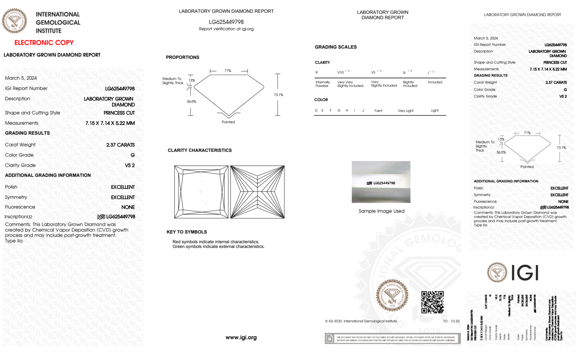 Your 2.37 carat Princess lab diamond is graded G color (Near Colorless), and you can read more about G color diamonds here.