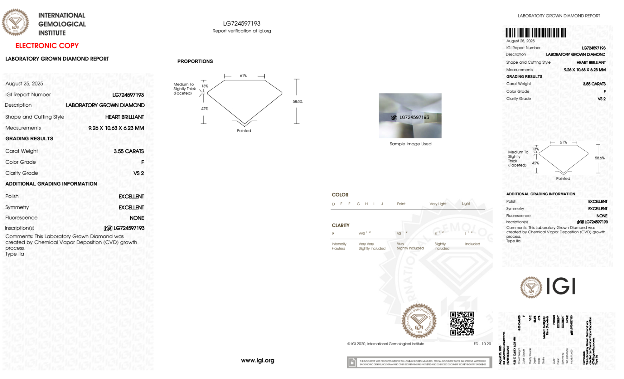Your 3.55 carat Heart lab diamond is graded F color (Colorless), and you can read more about F color diamonds here.