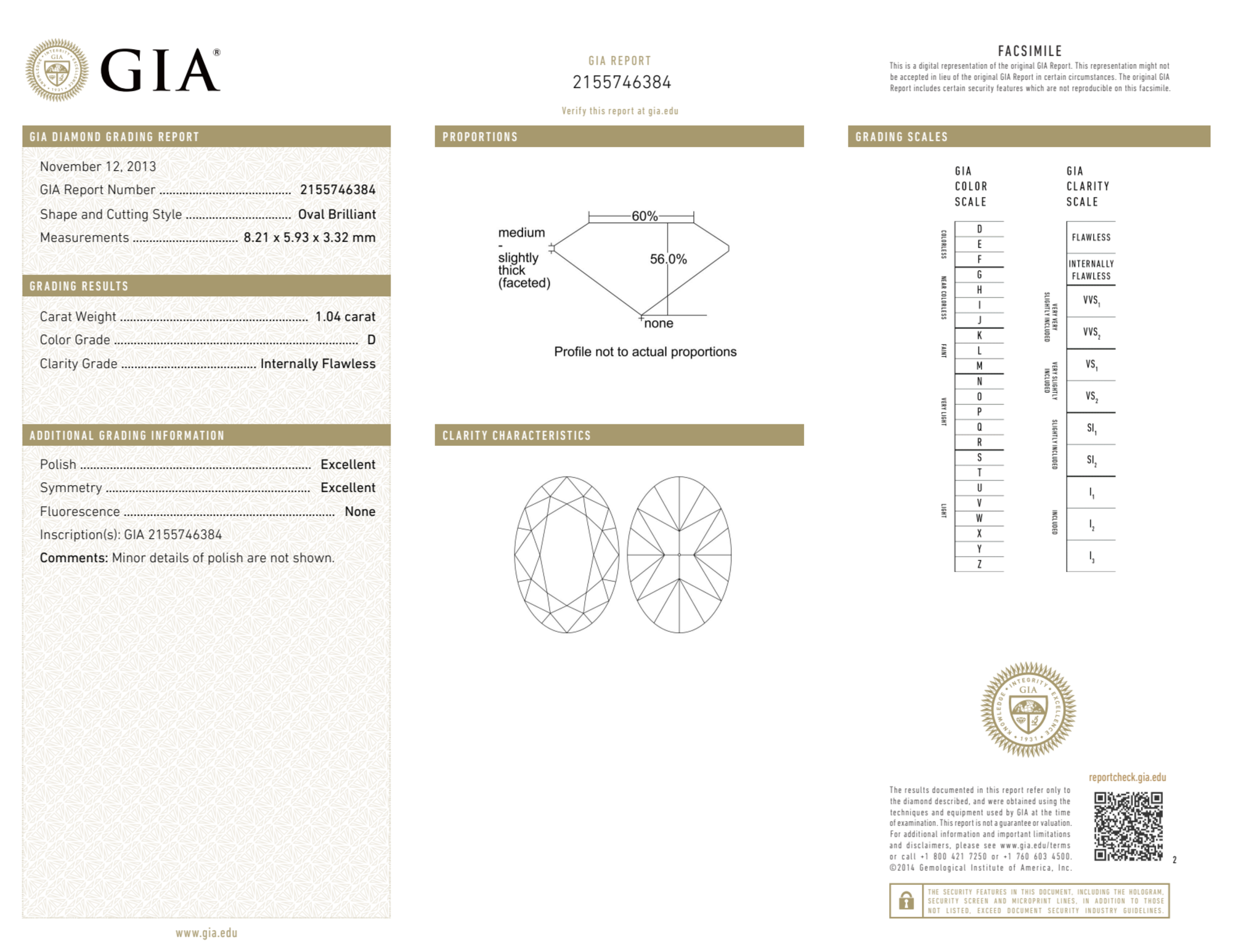 Your 1.04 carat Oval natural diamond is graded IF clarity, which stands for Internally Flawless. Read more about IF clarity diamonds here, or learn more about diamond clarity in general here.
