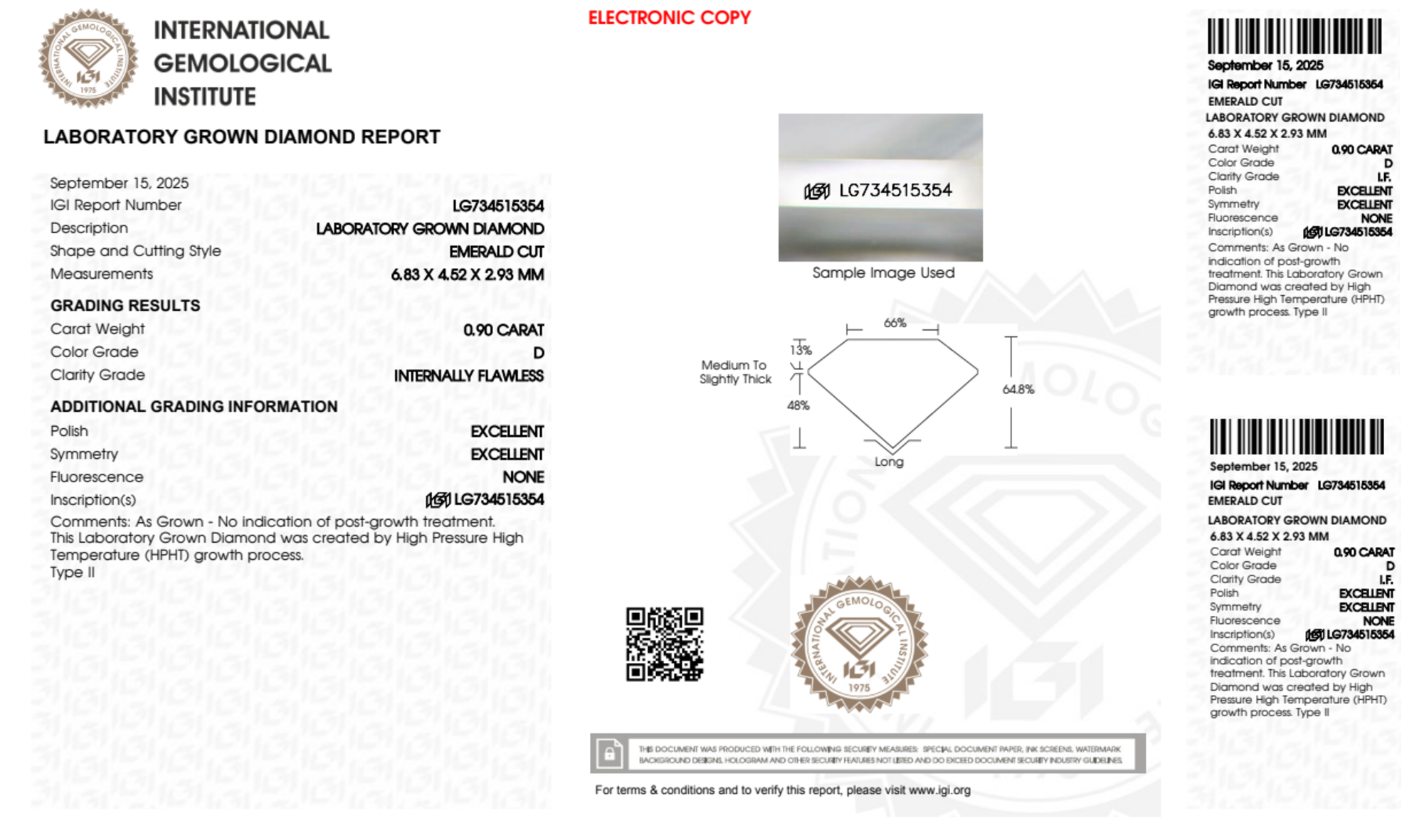 Your 0.90 carat Emerald lab diamond is graded IF clarity, which stands for Internally Flawless. Read more about IF clarity diamonds here, or learn more about diamond clarity in general here.
