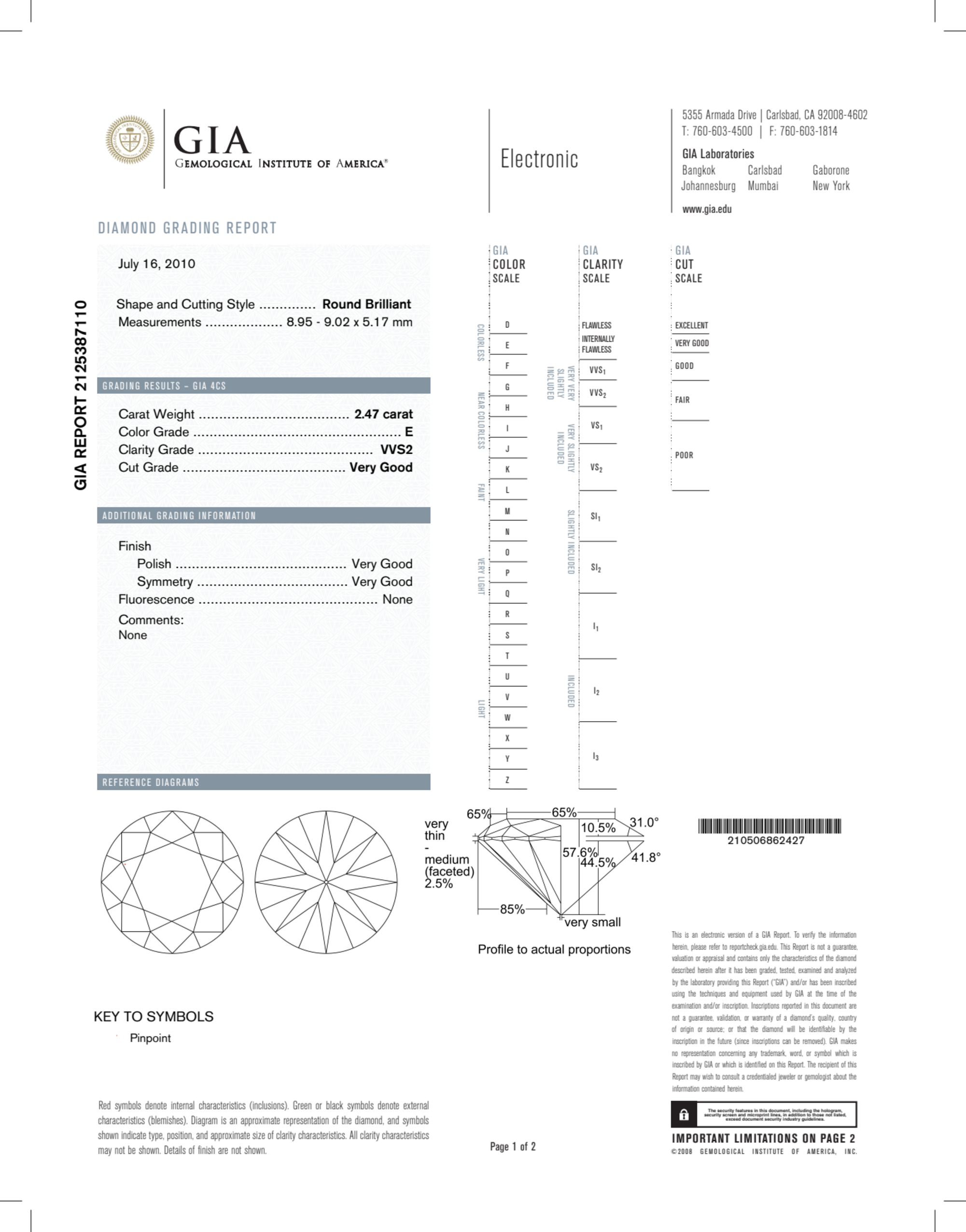 Your 2.47 carat Round natural diamond is graded E color (Colorless), and you can read more about E color diamonds here.