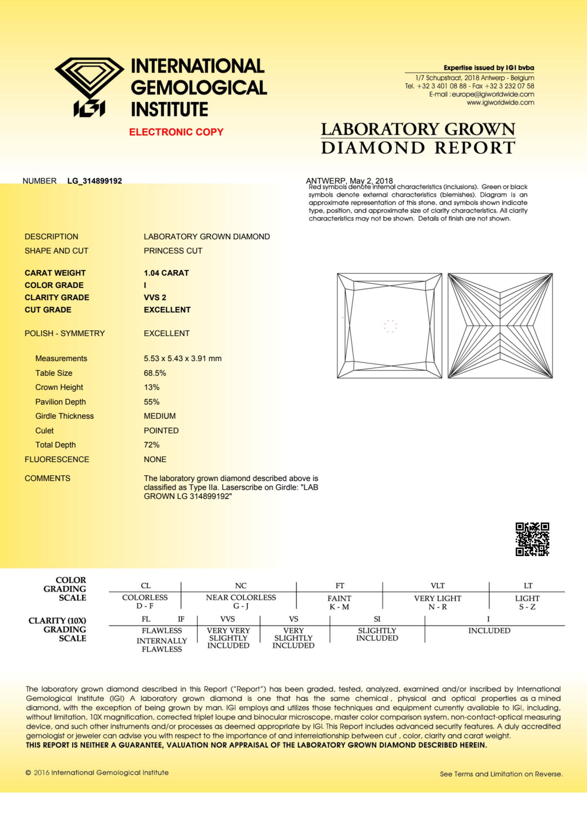 Your 1.04 carat Princess lab diamond is graded VVS2 clarity, which stands for Very Very Slightly Included 2. Read more about VVS2 clarity diamonds here, or learn more about diamond clarity in general here.