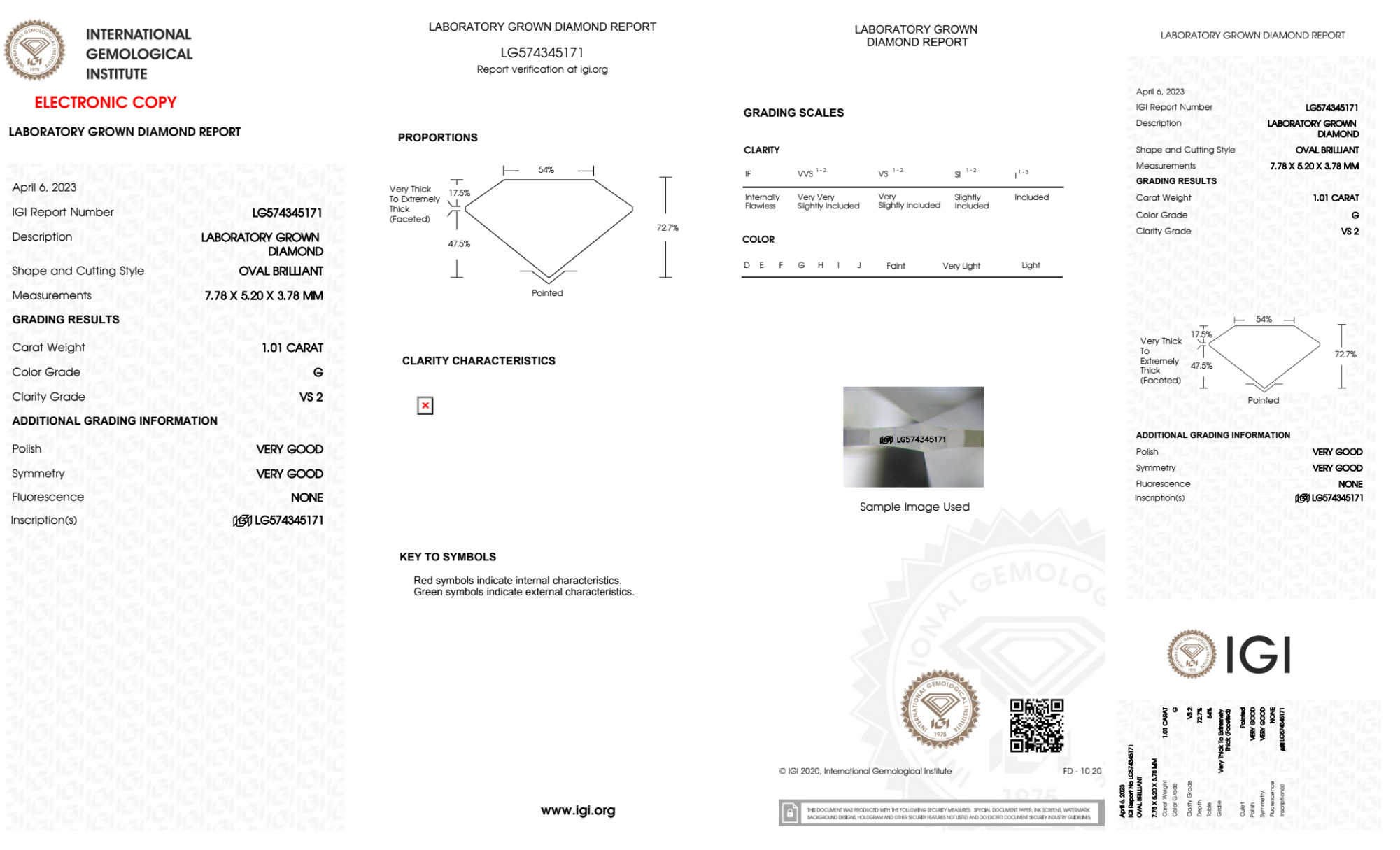 Your 1.01 carat Oval lab diamond is graded G color (Near Colorless), and you can read more about G color diamonds here.
