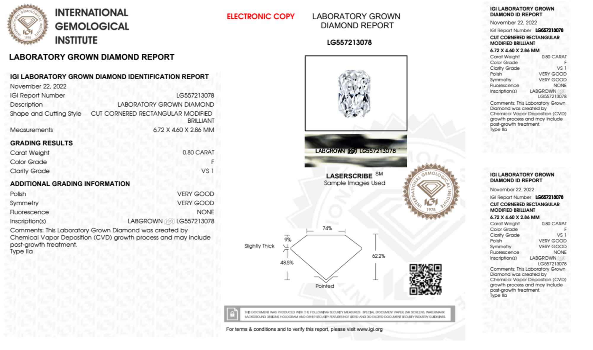 Your 0.80 carat Radiant lab diamond is graded F color (Colorless), and you can read more about F color diamonds here.