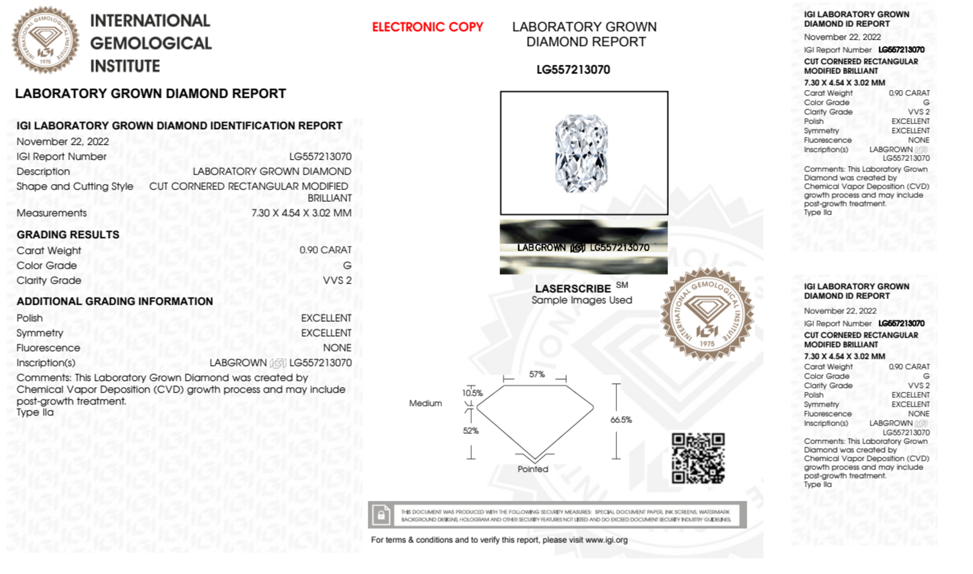 Your 0.90 carat Radiant lab diamond is graded G color (Near Colorless), and you can read more about G color diamonds here.