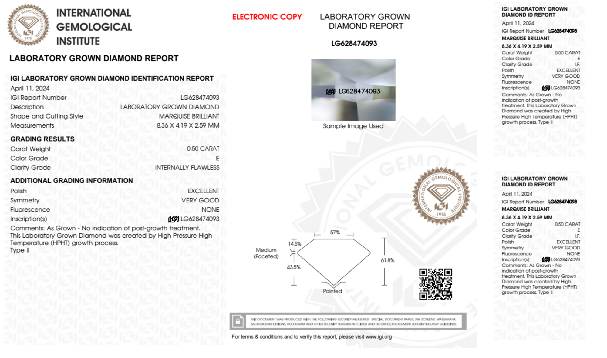 Your 0.50 carat Marquise lab diamond is graded IF clarity, which stands for Internally Flawless. Read more about IF clarity diamonds here, or learn more about diamond clarity in general here.