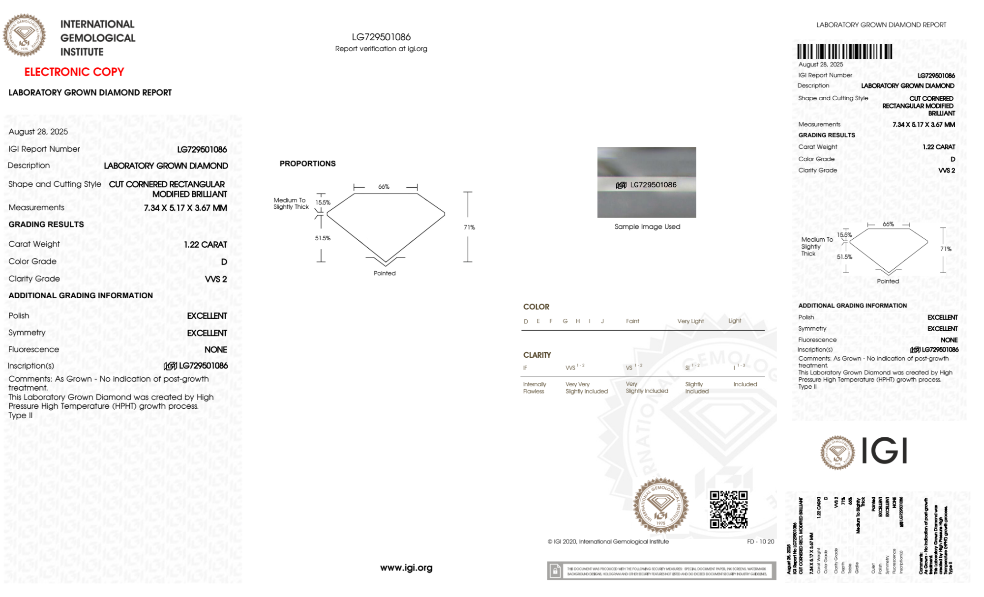 Your 1.22 carat Radiant lab diamond is graded D color (Colorless), and you can read more about D color diamonds here.