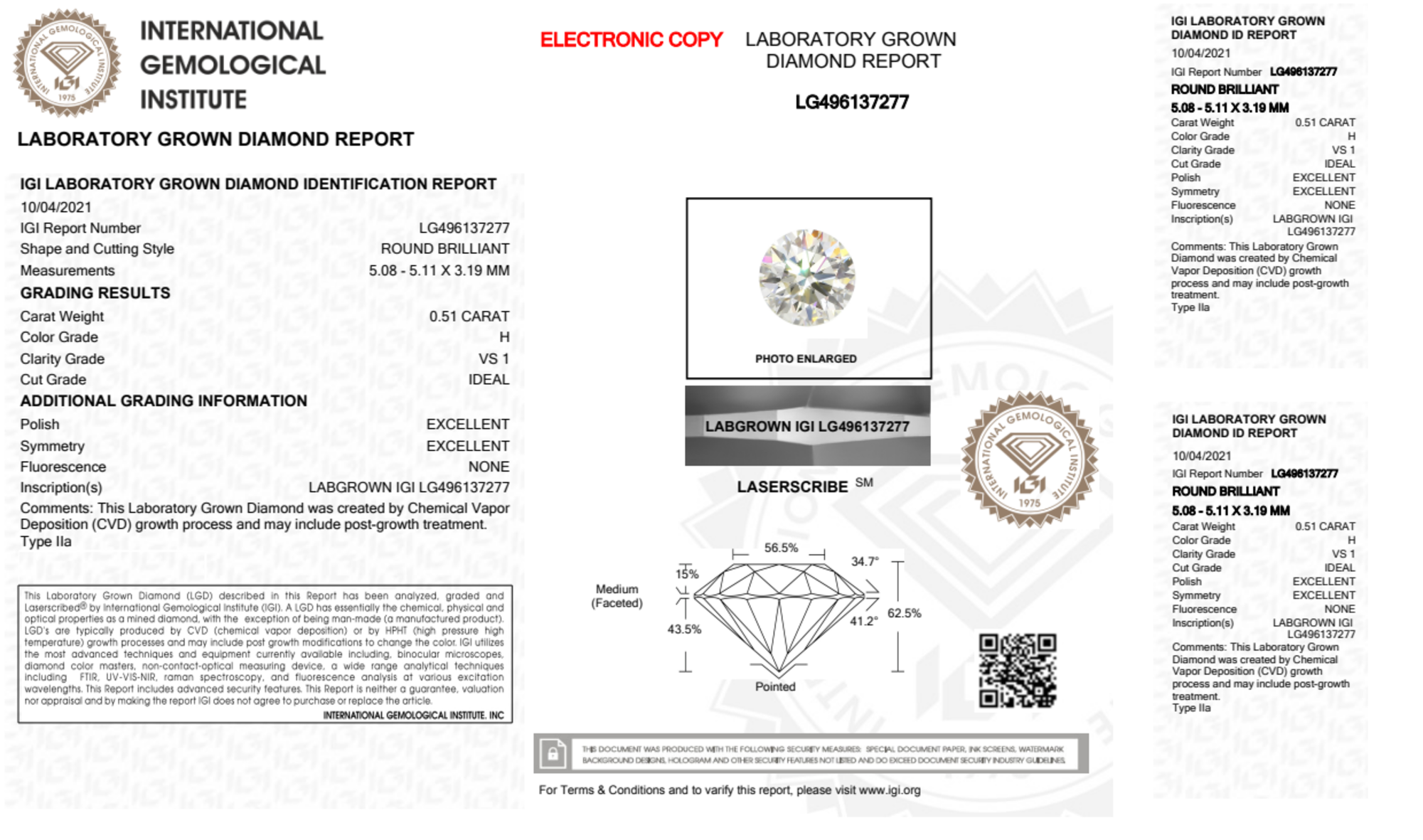 Your 0.51 carat Round lab diamond is graded H color (Near Colorless), and you can read more about H color diamonds here.