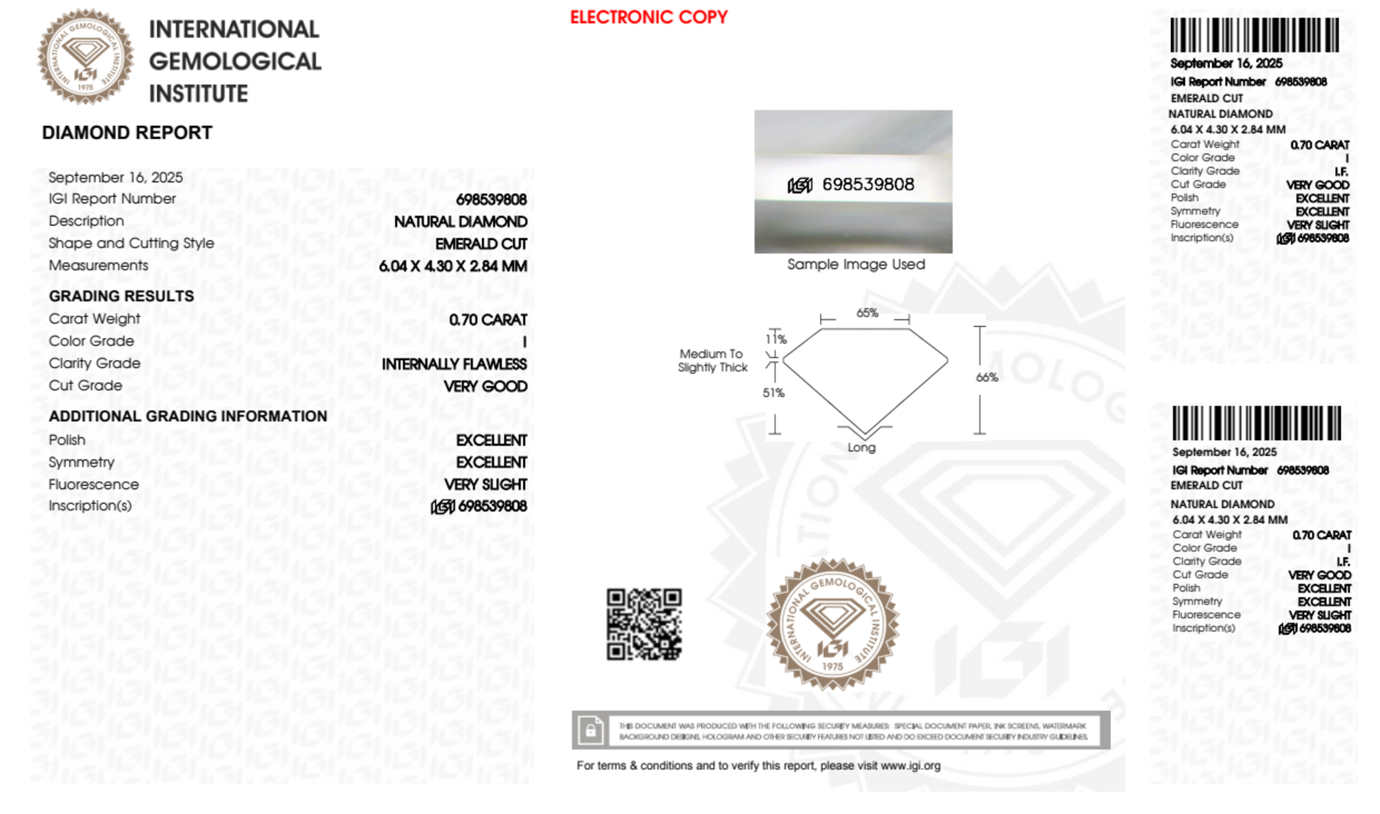 Your 0.70 carat Emerald natural diamond is graded IF clarity, which stands for Internally Flawless. Read more about IF clarity diamonds here, or learn more about diamond clarity in general here.