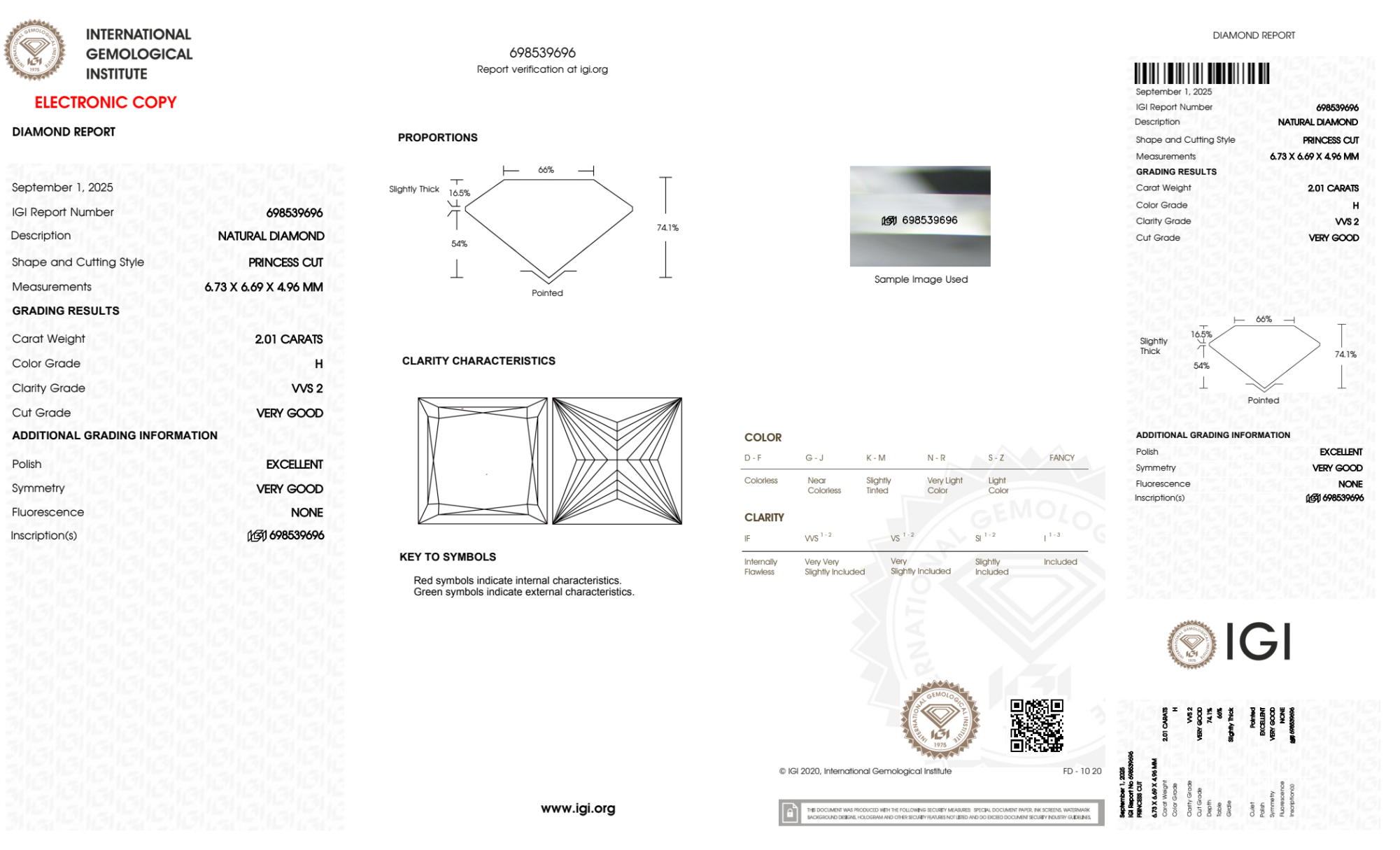 Your 2.01 carat Princess natural diamond is graded VVS2 clarity, which stands for Very Very Slightly Included 2. Read more about VVS2 clarity diamonds here, or learn more about diamond clarity in general here.