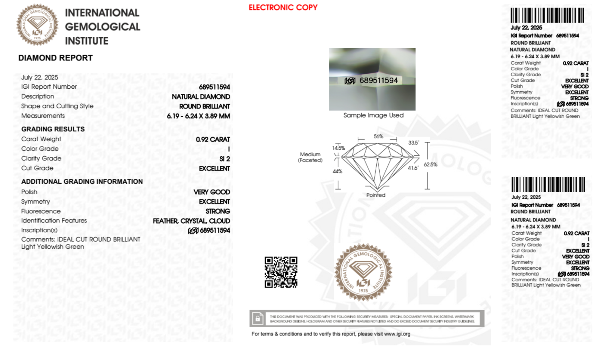 Your 0.92 carat Round natural diamond is graded SI2 clarity, which stands for Slightly Included 2. Read more about SI2 clarity diamonds here, or learn more about diamond clarity in general here.