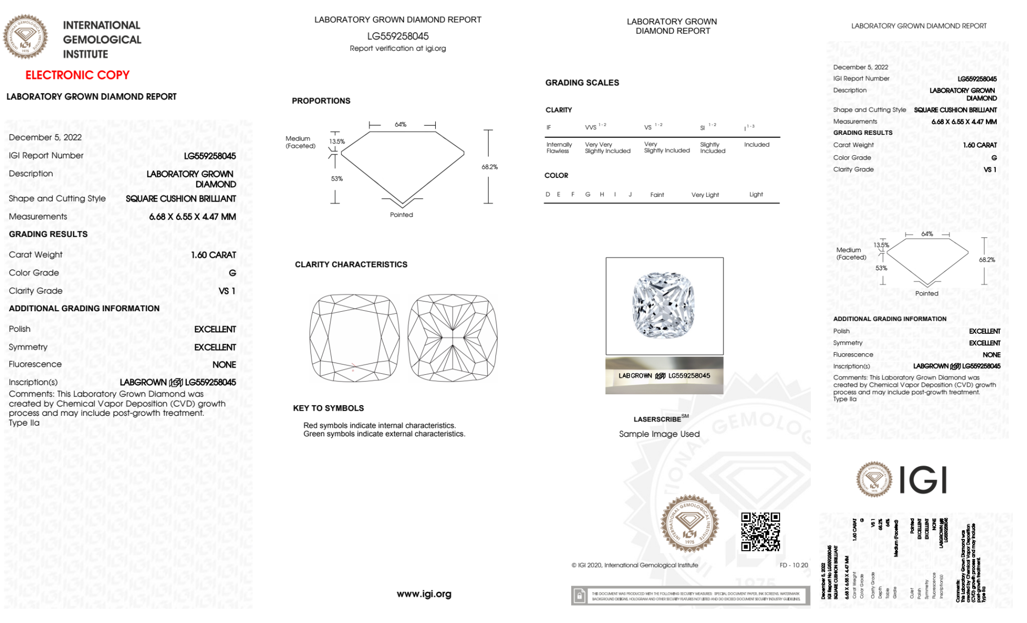 Your 1.60 carat Cushion lab diamond is graded G color (Near Colorless), and you can read more about G color diamonds here.
