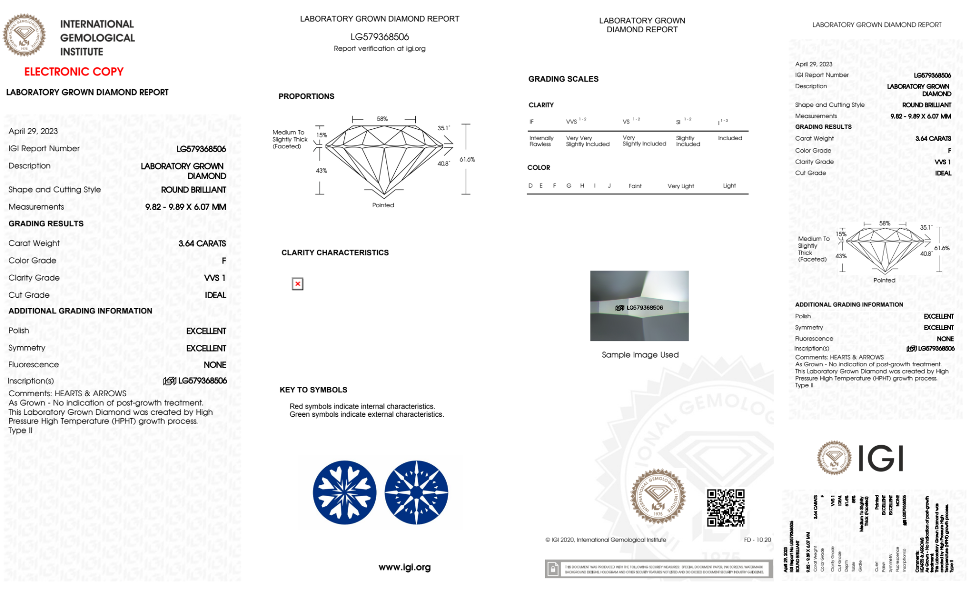 Your 3.64 carat Round lab diamond is graded VVS1 clarity, which stands for Very Very Slightly Included 1. Read more about VVS1 clarity diamonds here, or learn more about diamond clarity in general here.