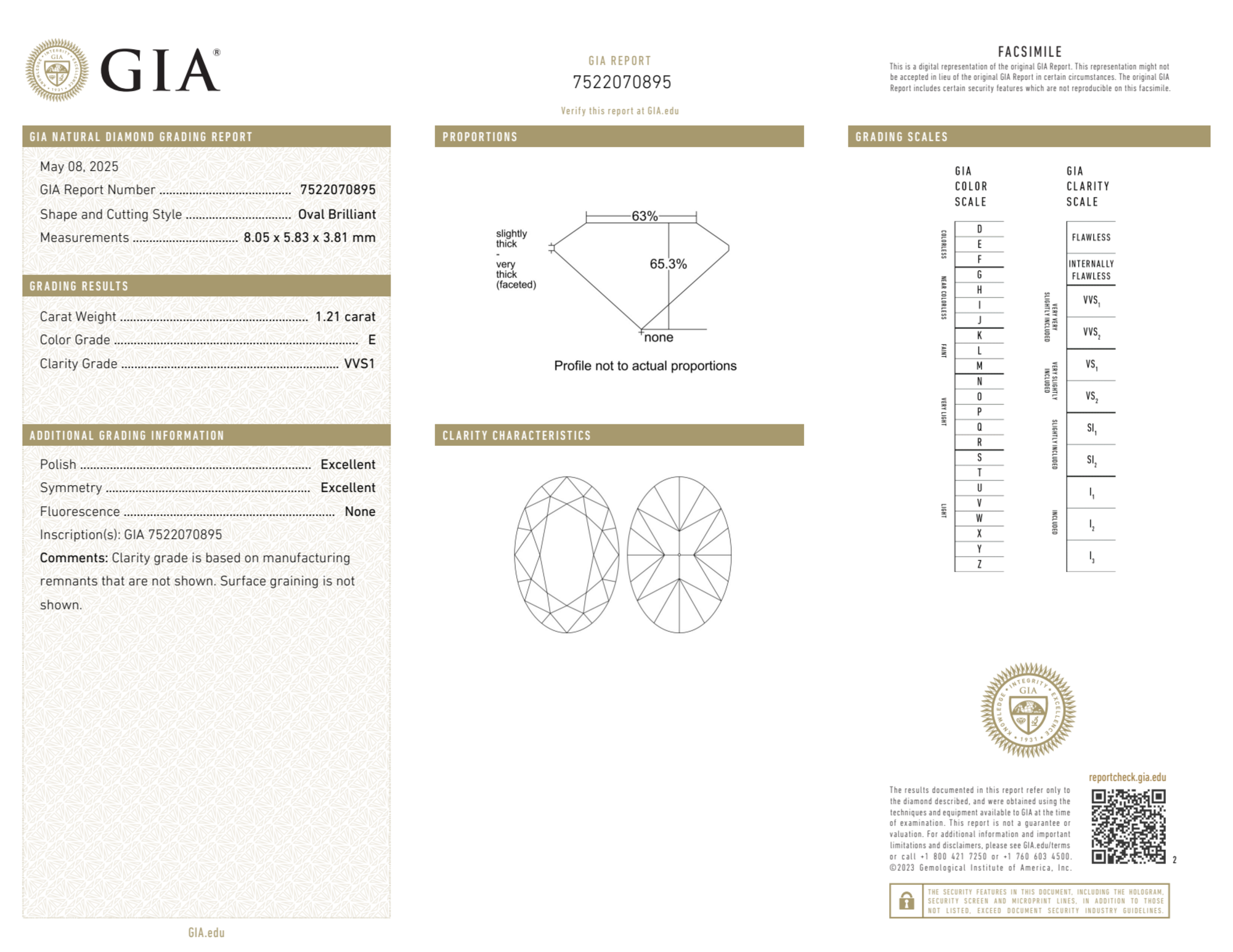 Your 1.21 carat Oval natural diamond is graded VVS1 clarity, which stands for Very Very Slightly Included 1. Read more about VVS1 clarity diamonds here, or learn more about diamond clarity in general here.