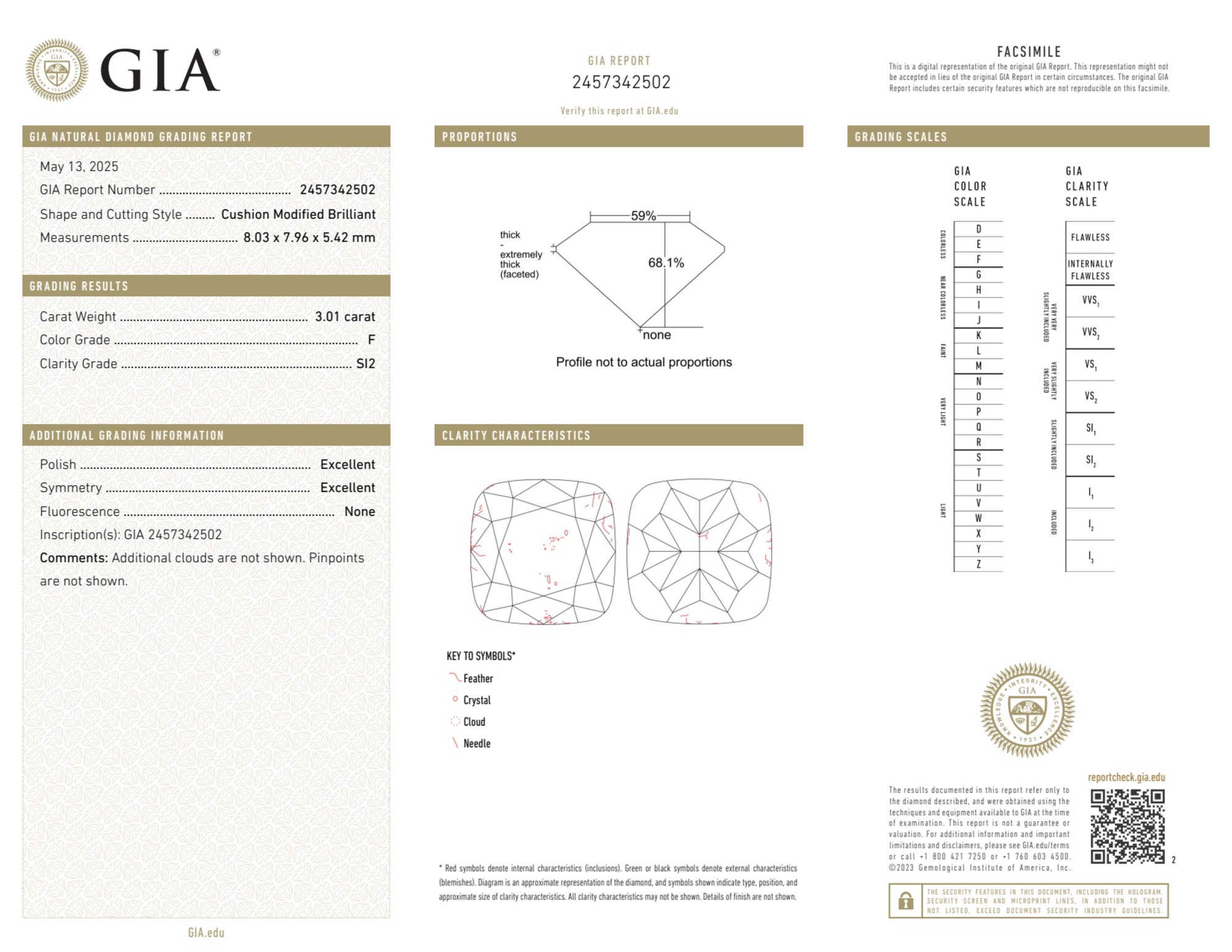 Your 3.01 carat Cushion natural diamond is graded F color (Colorless), and you can read more about F color diamonds here.