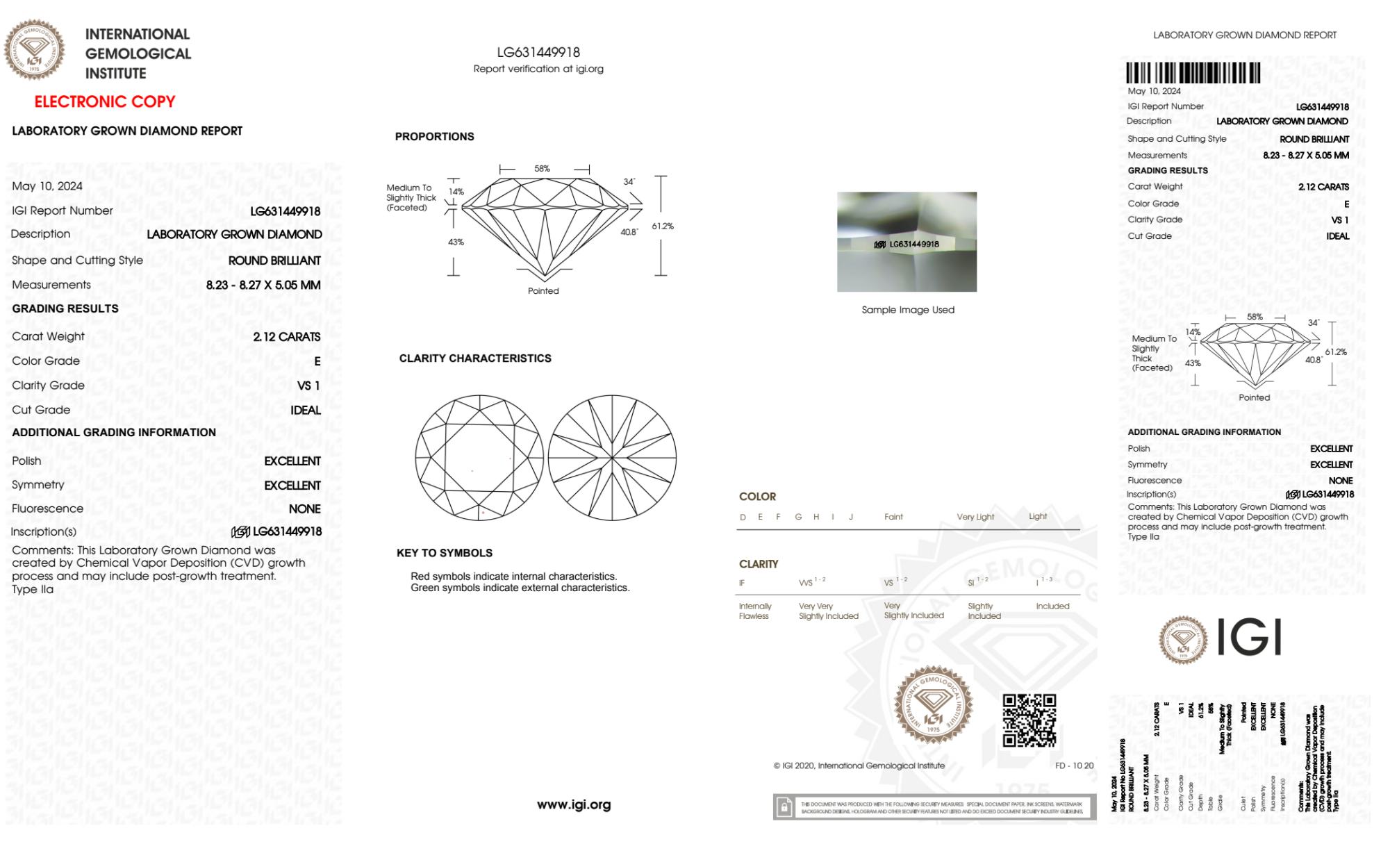 Your 2.12 carat Round lab diamond is graded E color (Colorless), and you can read more about E color diamonds here.
